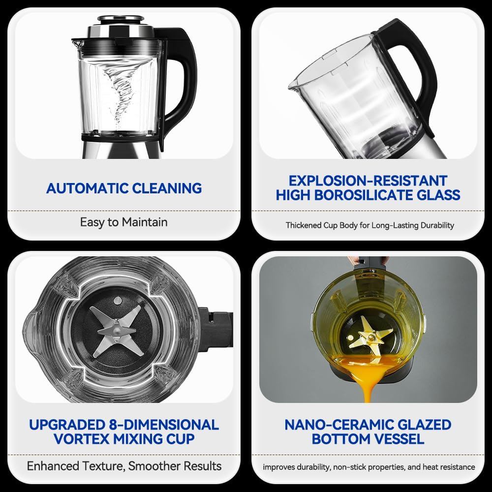 - Self-Cleaning Glass Blender Frees Up Your Time – This glass jar blender includes a 158°F auto steam clean mode. It heats in 2–3 minutes, then spins at high speed to remove grease and food residue. A must-have for anyone wanting a glass blender for kitchen that’s powerful and easy to maintain.