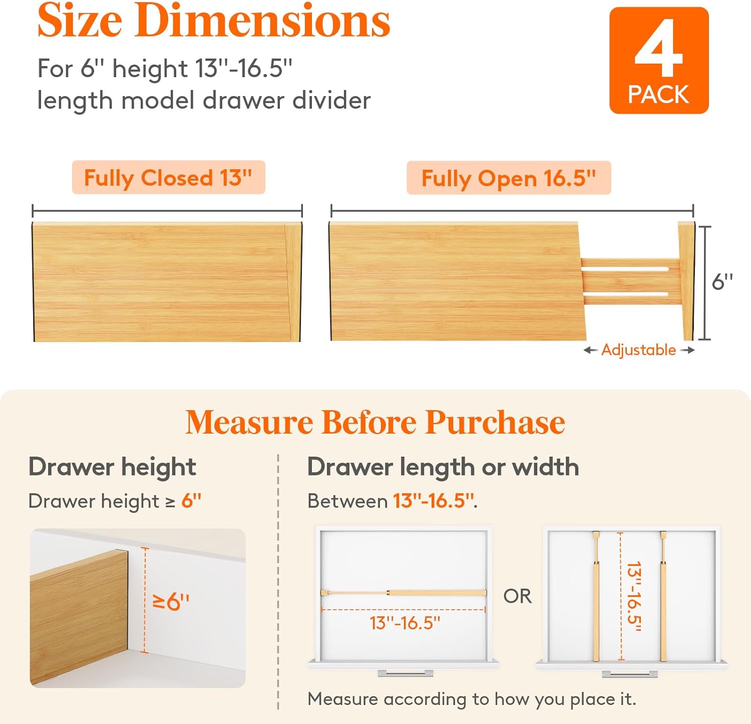 Lifewit 4 Pack 6" Deep Bamboo Drawer Dividers, 13-16.5" Expandable Drawer Organisers for Clothes, Adjustable Dresser Drawer Divider, Clothing Drawers Separators for Dresser, Bedroom, Bathroom, Office