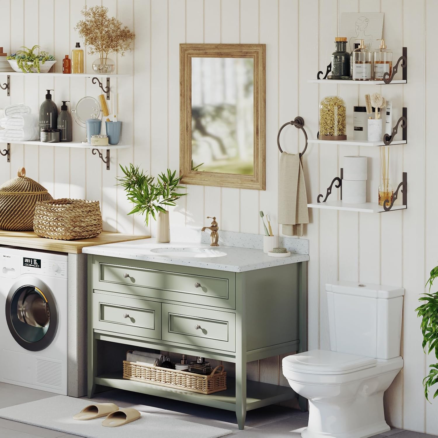 - 【Versatile in Any Room】Metal brackets can be installed on the top or bottom of the shelf. Use it as a bookshelf in the study, a floating nightstand in the bedroom, a display shelf for family photos and legos in the living room, a bathroom shelves for toiletries. Upgrade your kitchen and laundry with these ledges