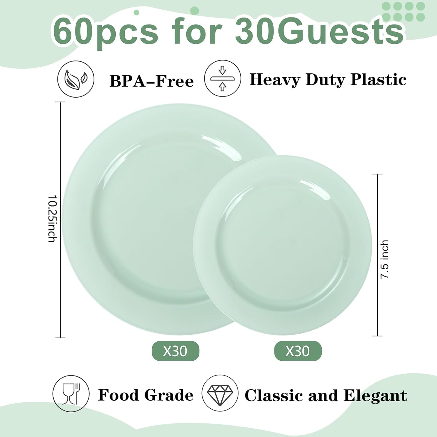 FLOWERCAT 60PCS Sage Green Plates - Heavy Duty Plastic Plates Disposable for Party/Easter - Include 30PCS 10.25inch Sage Green Dinner Plates and 30PCS 7.5inch Dessert Plates