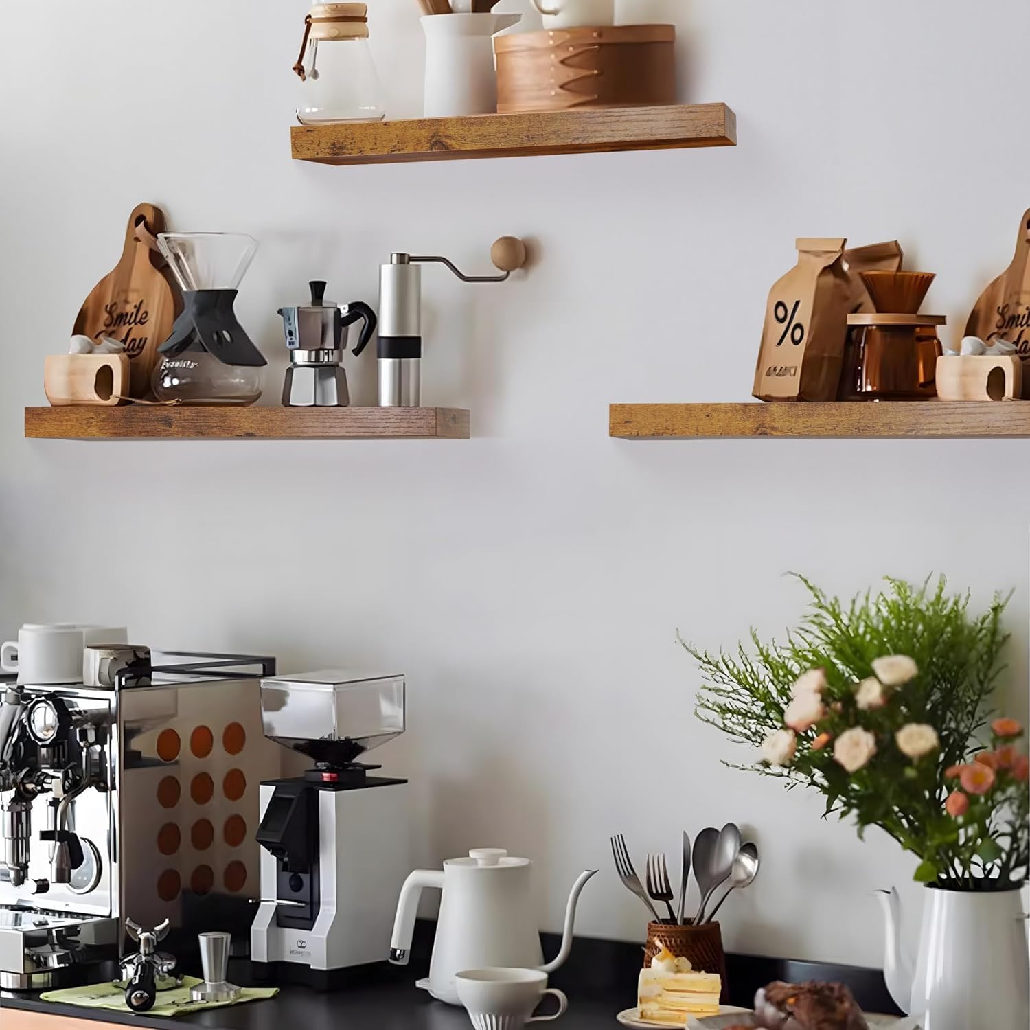 - STRONG AND DURABLE: Crafted from high-quality materials, these kitchen wall shelves are 1.3 inches thick and 11 inches wide, capable of holding up to 50 pounds. Solid brackets ensure no sagging or wobbling, providing reliable support for your favorite items.