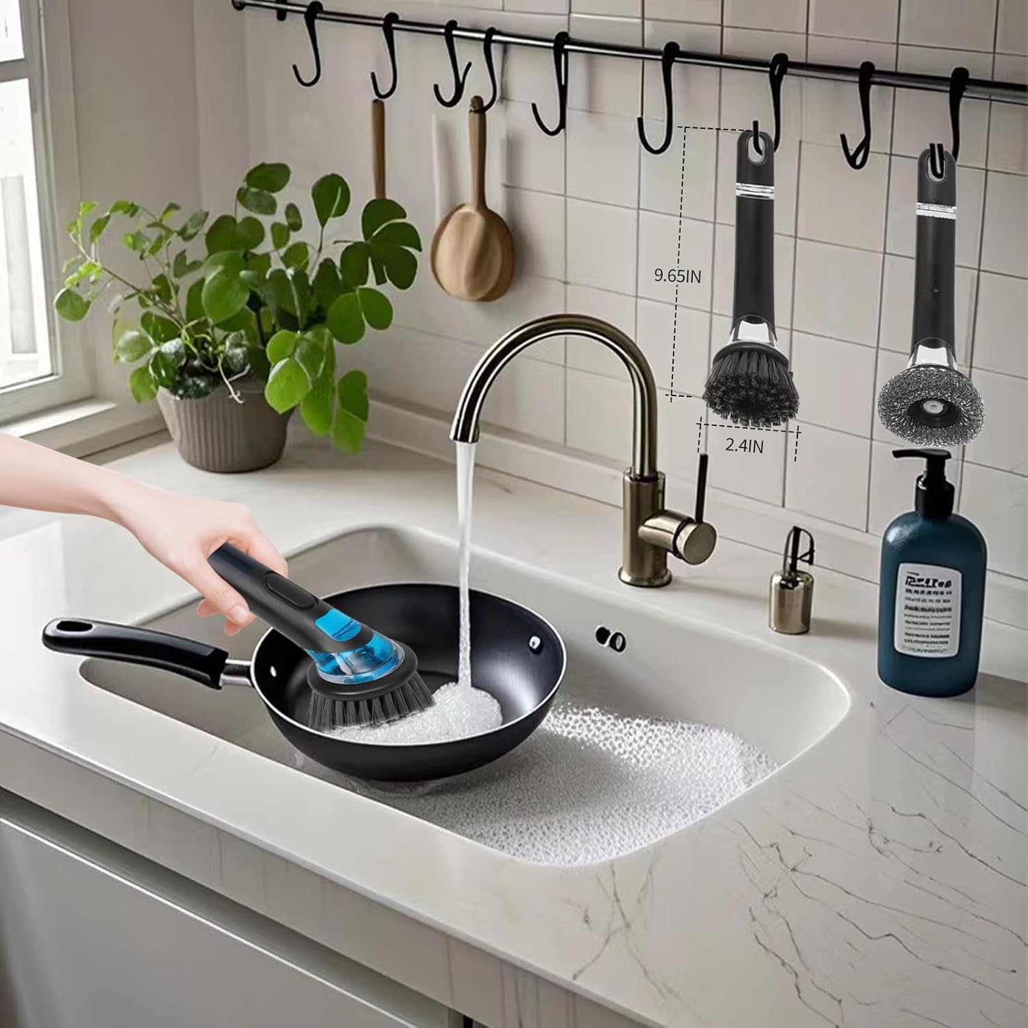 - 【Durable Kitchen Cleaning Brush】Kitchen Cleaning Brush with Soap Dispenser, 2 packs, a 304 stainless steel round head cleaning brush, a PP nylon brush head cleaning brush, made of sturdy body structure is not easy to fall off the process, no scratches, no odor, high temperature resistant material, durable.