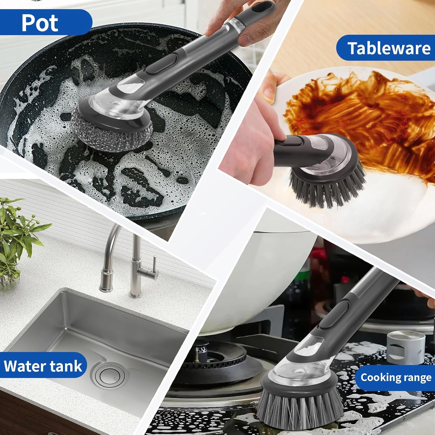- 【Wide Range of Use】Our cleaning brush with soap dispenser function will be a great addition to your home cleaning collection. Not only can it be used to clean dishes and cookware, it can also be used to clean windows, sinks, stoves, countertops, floors, toilets and bathrooms. You can also use it in bars, coffee shops, hotels and restaurants.