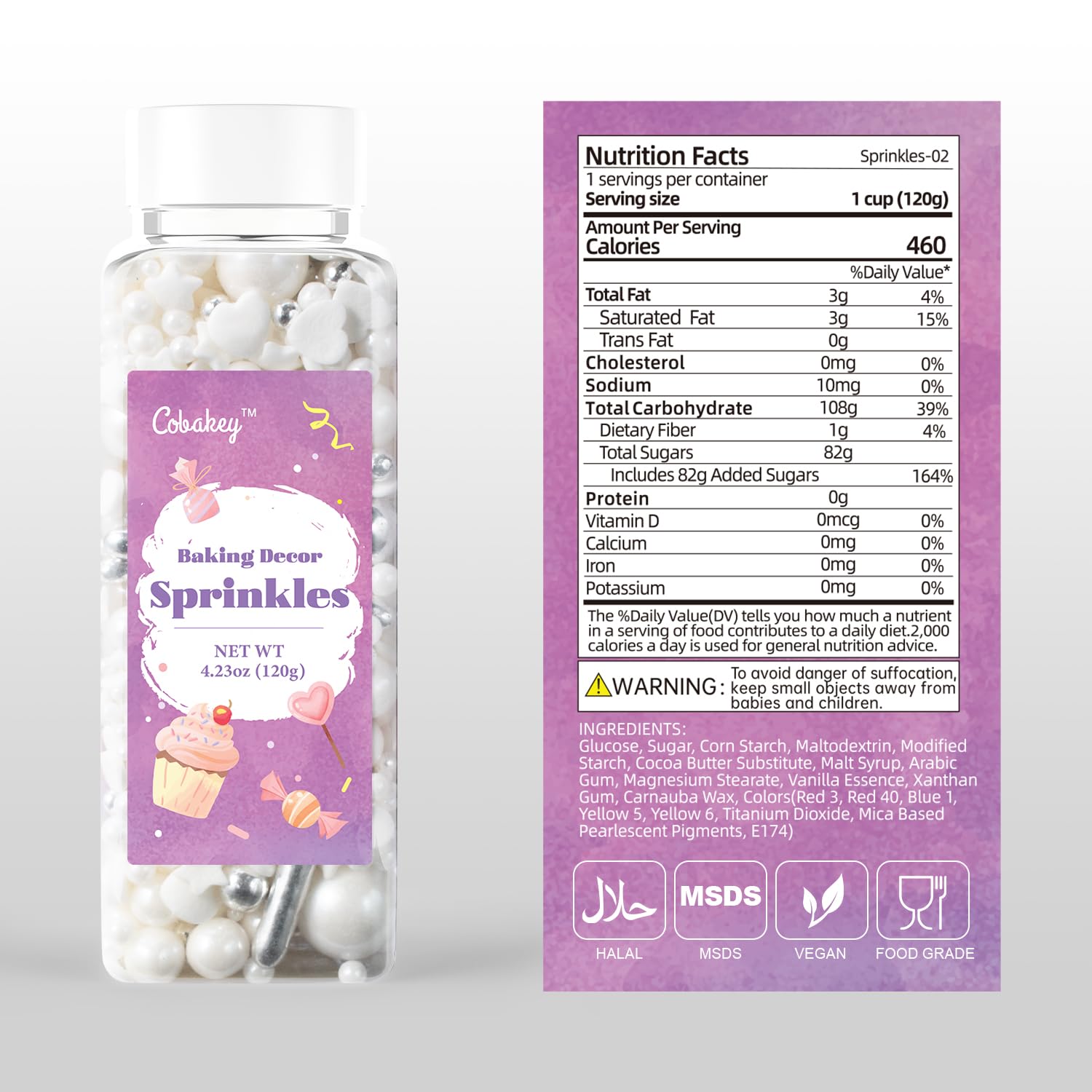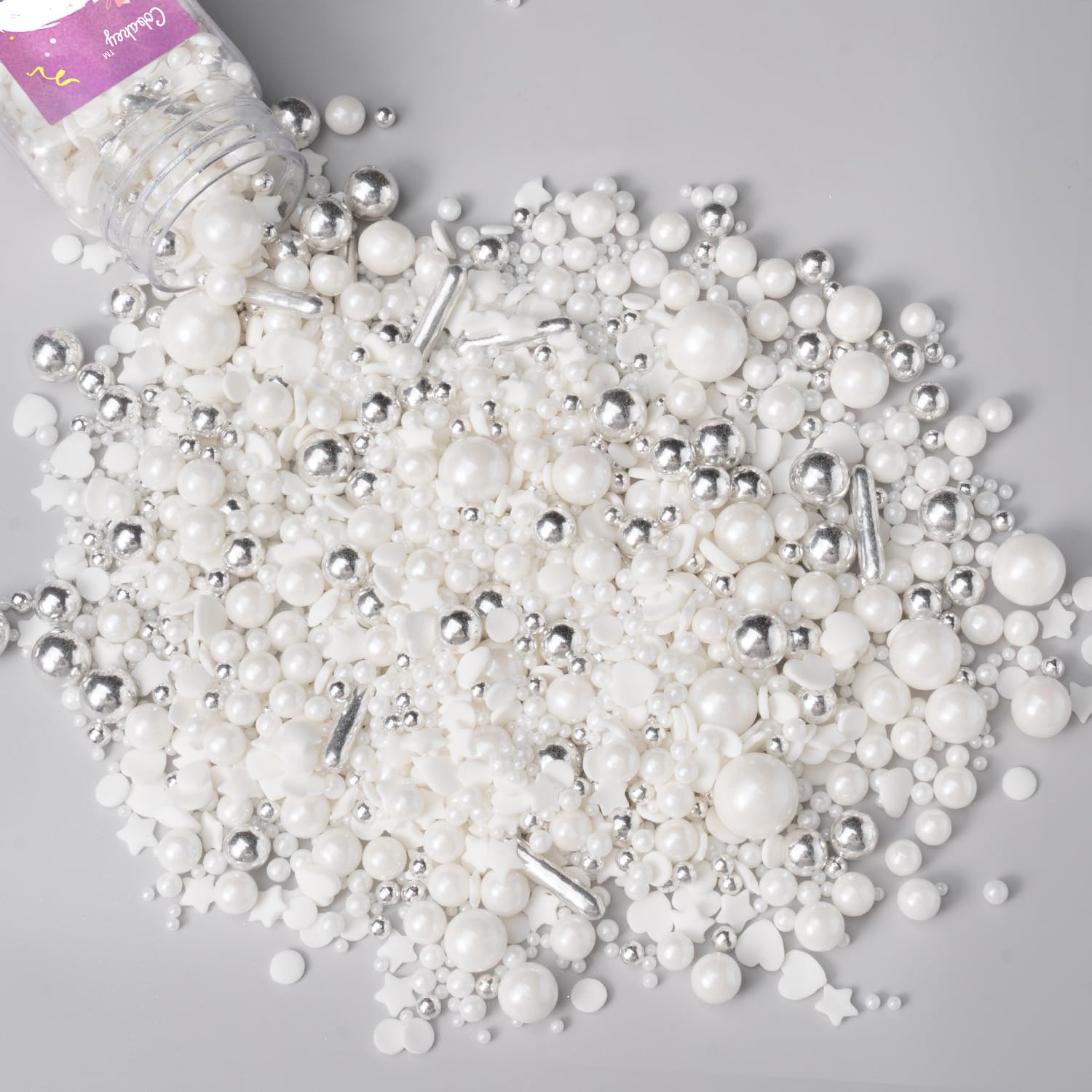 - Pearl Sprinkles: Each bottle weighs 4.23oz, 120g. Our silver & white sprinkles are made from safe ingredients. Our cake sprinkles are in different shapes of Heart and Pearl Sprinkles.