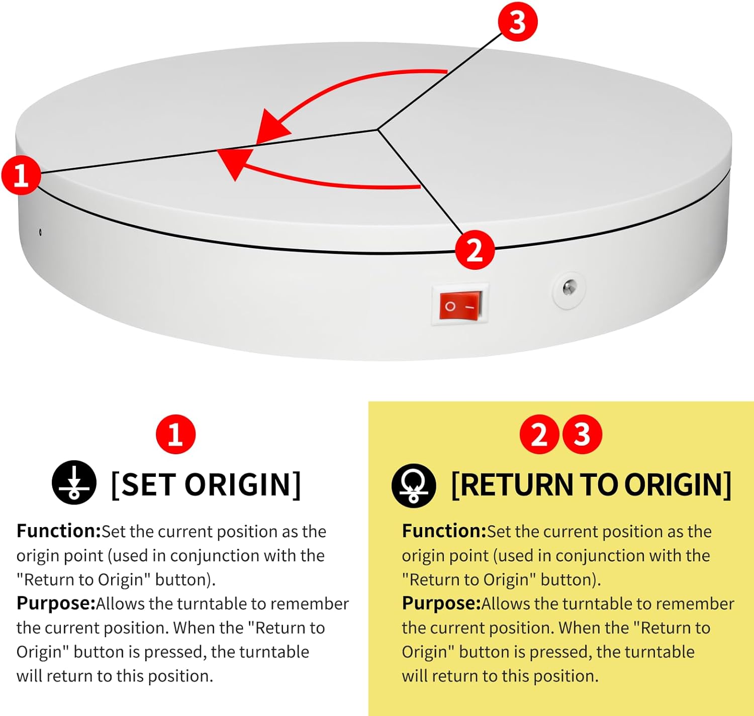 - 【This Electric turntable includes a Professional Flagship Remote Controller】:Precise angle settings and user-friendly combination key design enable support for a wider range of applications. Support: Set the current position as the origin point (used in conjunction with the "Return to Origin" button). Support: Save the current settings to the turntable's internal flash. More versatile angle buttons and mode button combinations provide greater flexibility for various applications