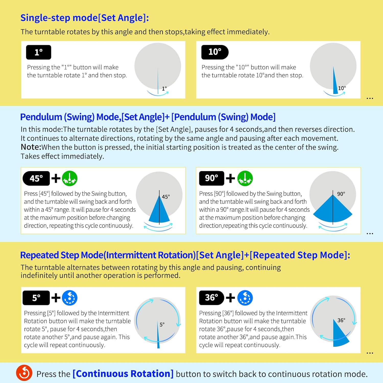 - Special Feature : Five rotation modes, High-Precision stepper turntable, Multi-step Within One Circle Mode, Pendulum (Swing) Mode, Set the current position and return to the position Five rotation modes, High-Precision stepper turntable, Multi-step Within One Circle Mode, Pendulum (Swing) Mode, Set the current position and return to the position