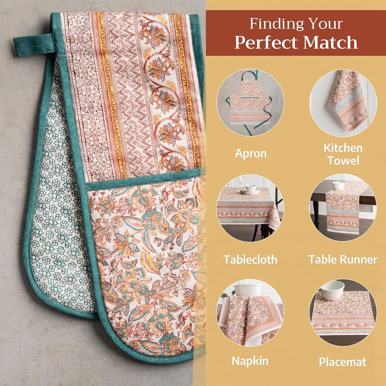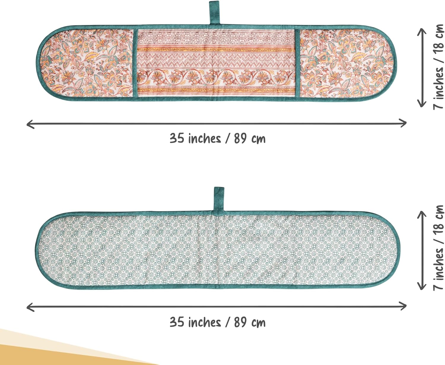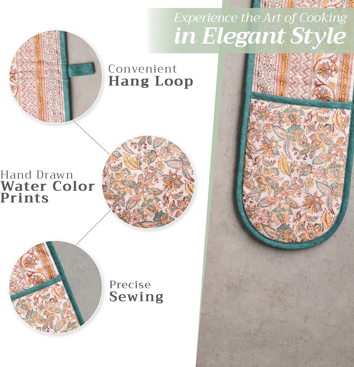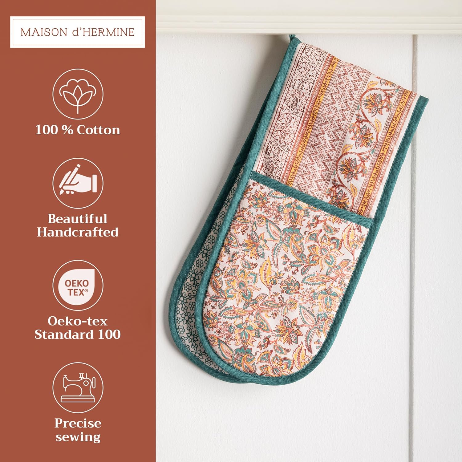- Package includes: Includes 1 double oven mitt sized 7"x35". Perfect for handling hot cookware safely while adding a touch of European elegance to your kitchen. Designed in Europe and made in India with care