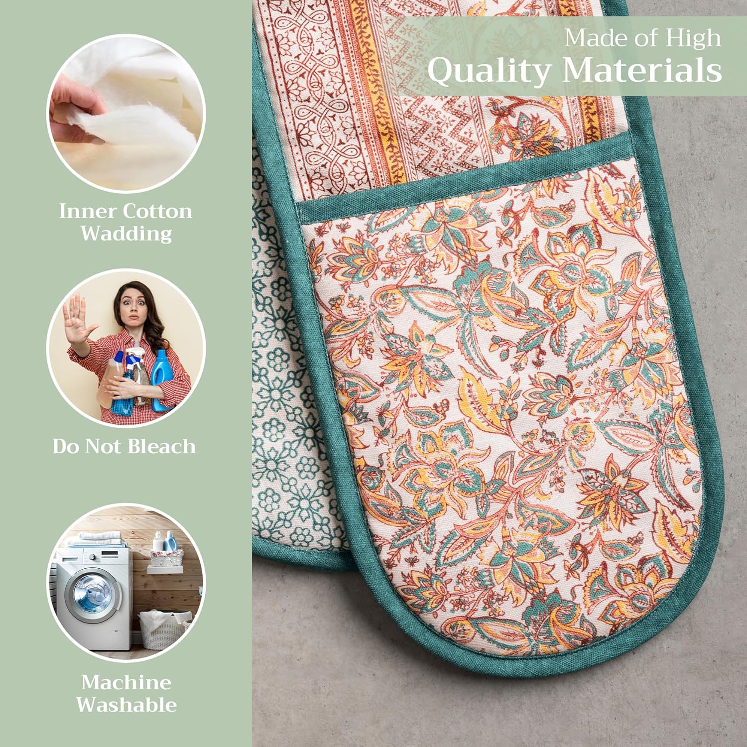 - 100% Quilted cotton: Crafted from premium quilted cotton for superior heat resistance and durability. This double oven mitt offers a soft, flexible grip and protects your hands during baking, roasting, or grilling