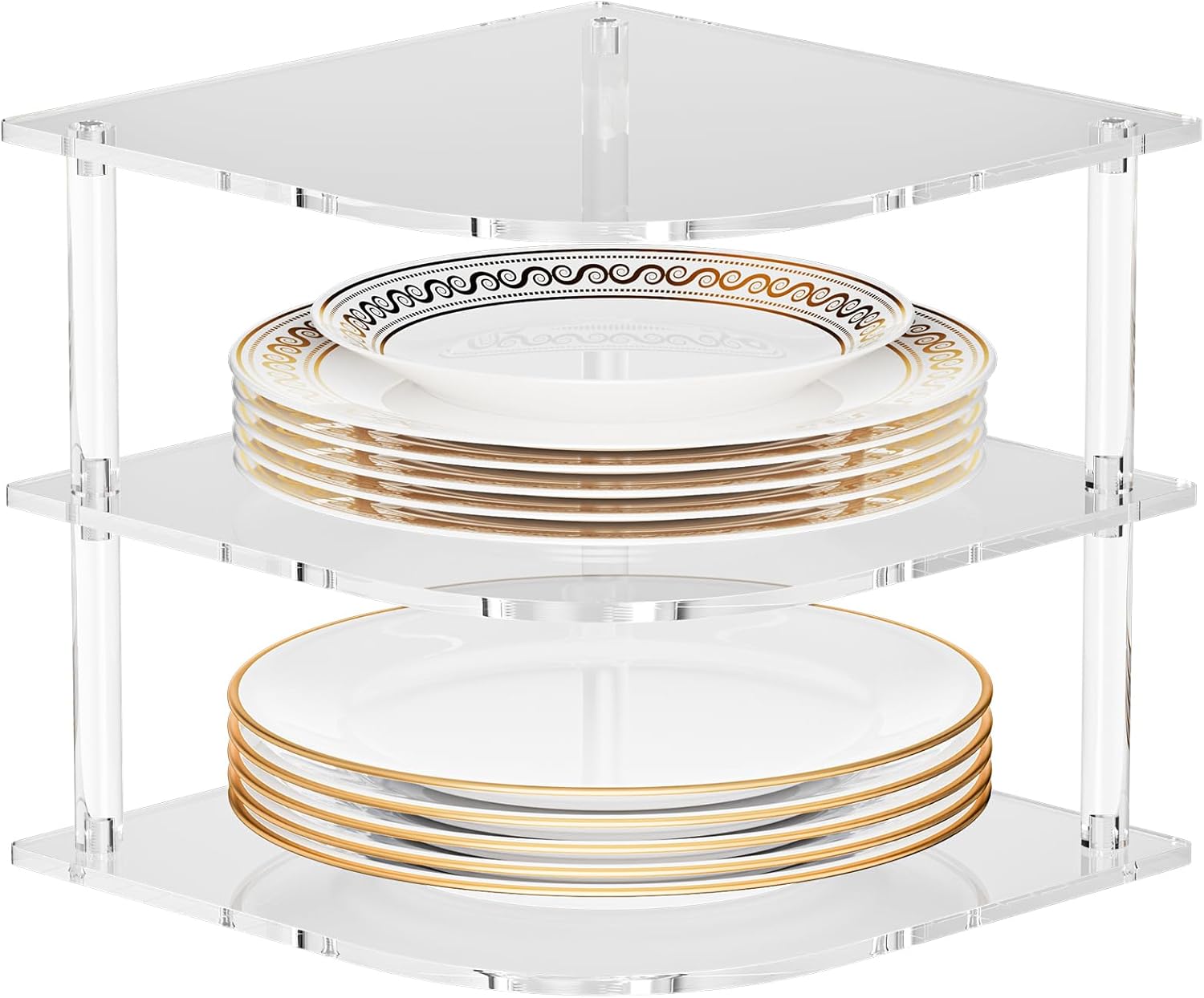 - MULTIFUNCTIONAL KITCHEN ORGANIZATION: All acrylic multi-tiered plate corner shelf design, both professional dinner plate rack can also be transformed into a kitchen dish storage layer or spice rack, bowl organizer in tight spaces. Perfect replacement for bulky bamboo corner racks, bathroom countertop corners can also store toiletries. It can help you make your home more tidy.