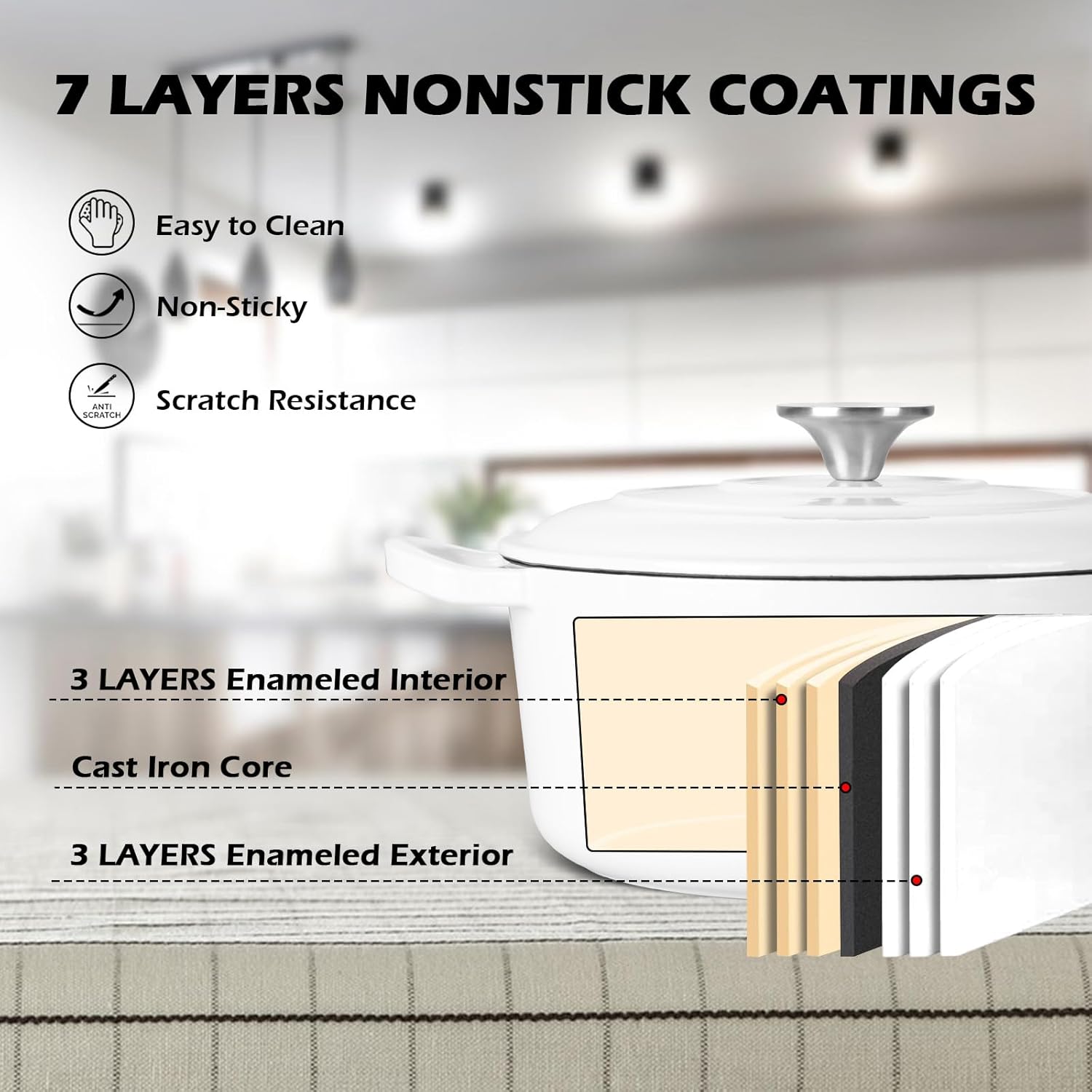 - Heavy Duty Material, Dutch oven pot with lid is made of 6 layers enamel and cast iron core layer, 4mm thickness pot wall with one-piece molding design enhance the strong construction without cracks or chips, high gloss enamel surface with no chemicals, form a layer of smooth coating to keep away from rusting and reduce food sticking