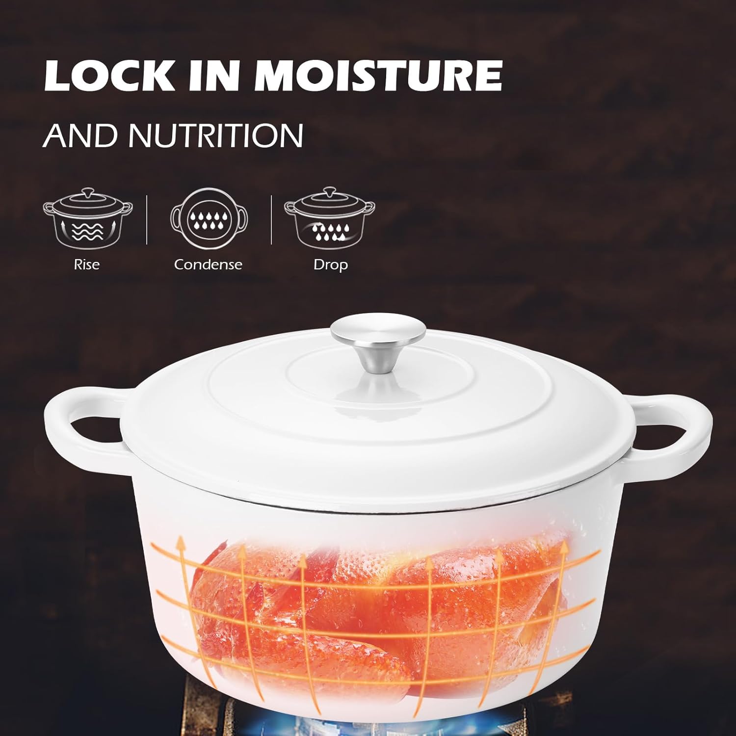 - Moisture-Rich Cooking, this enameled cast iron Dutch oven is design with circulating shower type lid, the raised design of the pot cover allows the water vapor circulates and locks inside the Dutch oven, fully releasing the flavor and nutrients of the ingredients, possess pretty heat retention performance