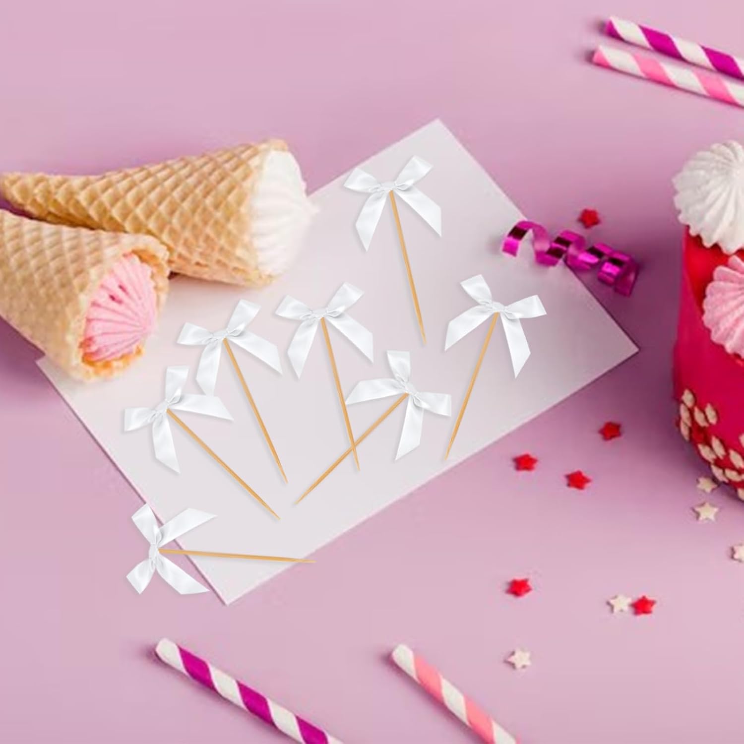 - Package included: The white bow birthday decorations set includes 40 pcs white bow cupcake toppers. Ensuring the perfect fit for your cupcakes and desserts, these pink bow cupcake decorations adding a fun and festive touch to your table setting