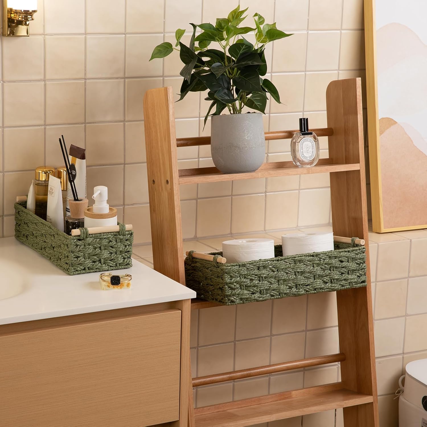 OIAHOMY Toilet Paper Baskets Handmade Paper Rope Decorative Wicker Storage Tank Shelf Cabinet Organizer for Bathroom Home, Set of 2, Green