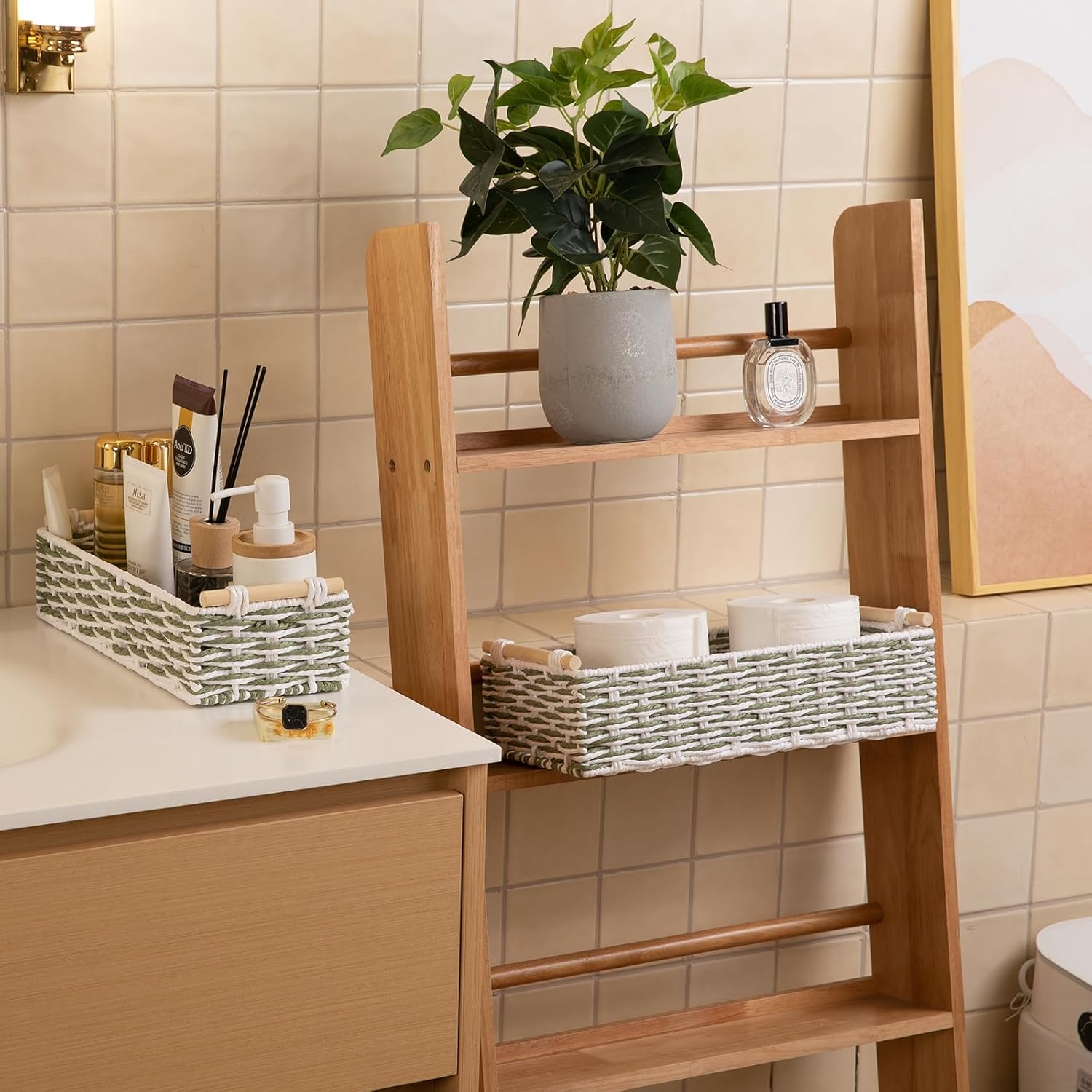 OIAHOMY Toilet Paper Baskets Handmade Paper Rope Decorative Wicker Storage Tank Shelf Cabinet Organizer for Bathroom Home, Set of 2, Green & White