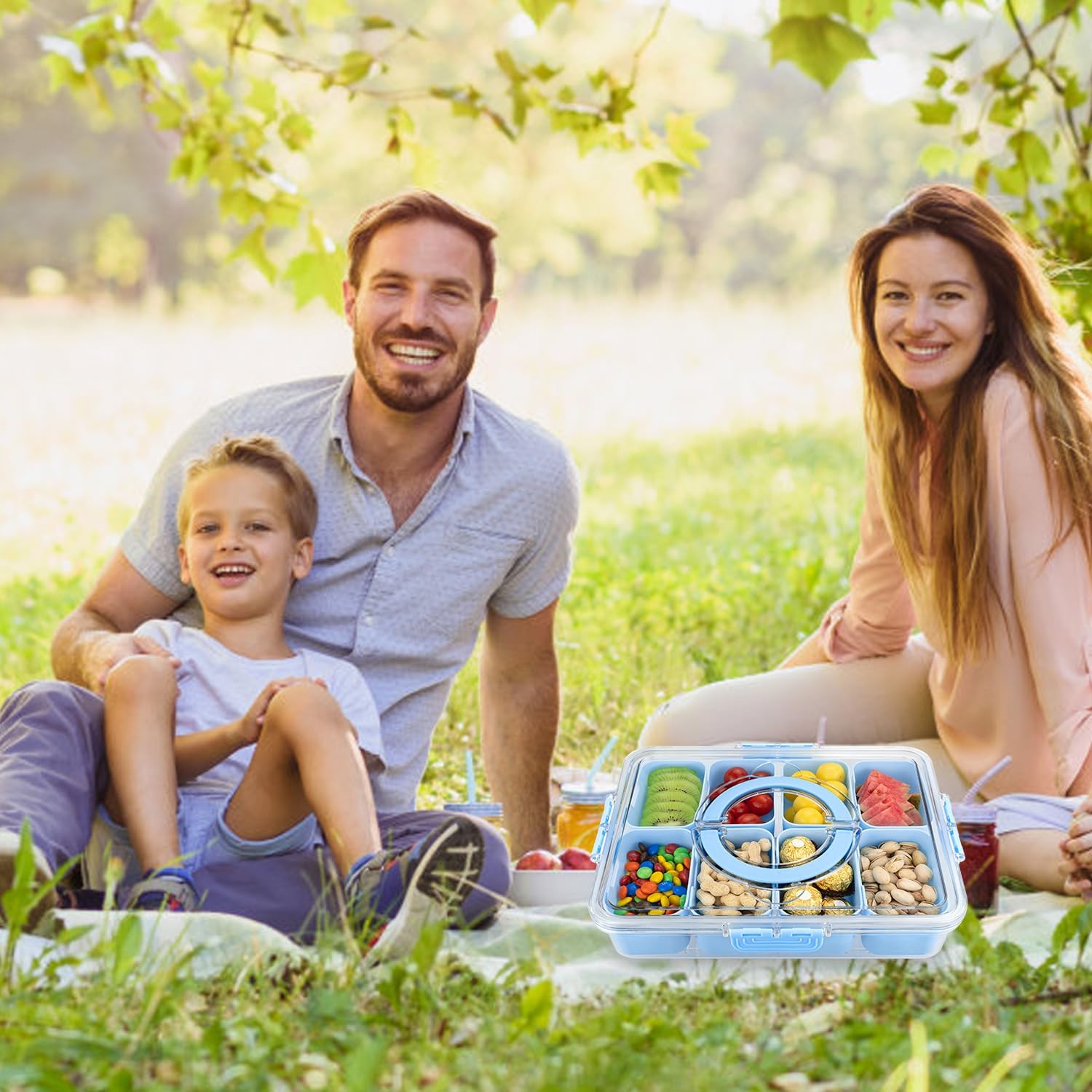 - 【Easy to Carry】Portable Snack Box The clear outer container has a portable handle on the lid.Thanks to the snap closure,the lid stays firmly attached to the container,so you can take the snack box anywhere with the help of the handle.It is suitable for outdoor travel, family gatherings and other occasions.