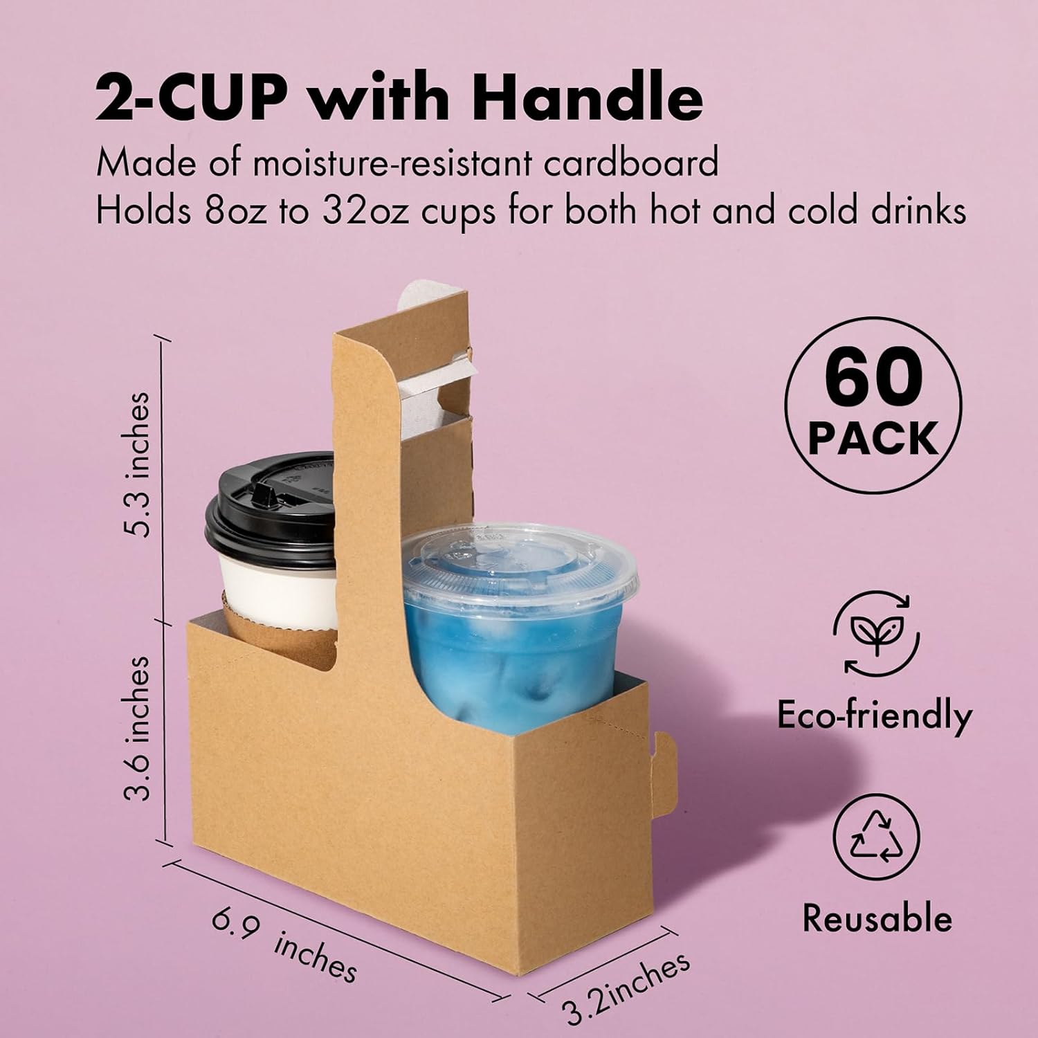 FMP Brands 2 Cup Disposable Drink Carrier with Handle, 60 Pack Kraft Paperboard Handled Drink Carriers 12-30 oz to Go Coffee Cup Holder, Cup Carrier for Cold Hot Drinks, Takeout, Cafe