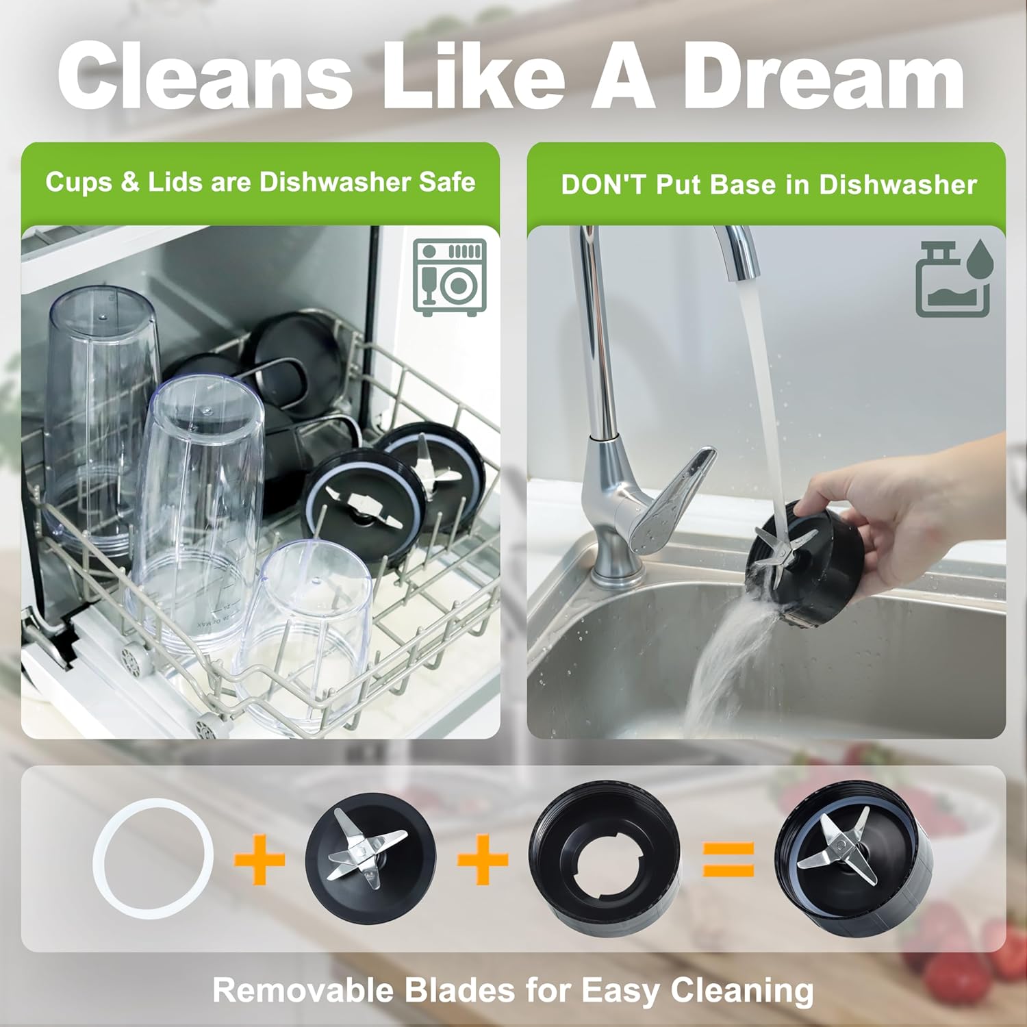 - Easy Operation & Cleaning: Press and hold to start, release to stop. Self-cleans in seconds with just soap and water. Detachable blades ensure thorough cleaning, while cups and lids are dishwasher-safe for added convenience.