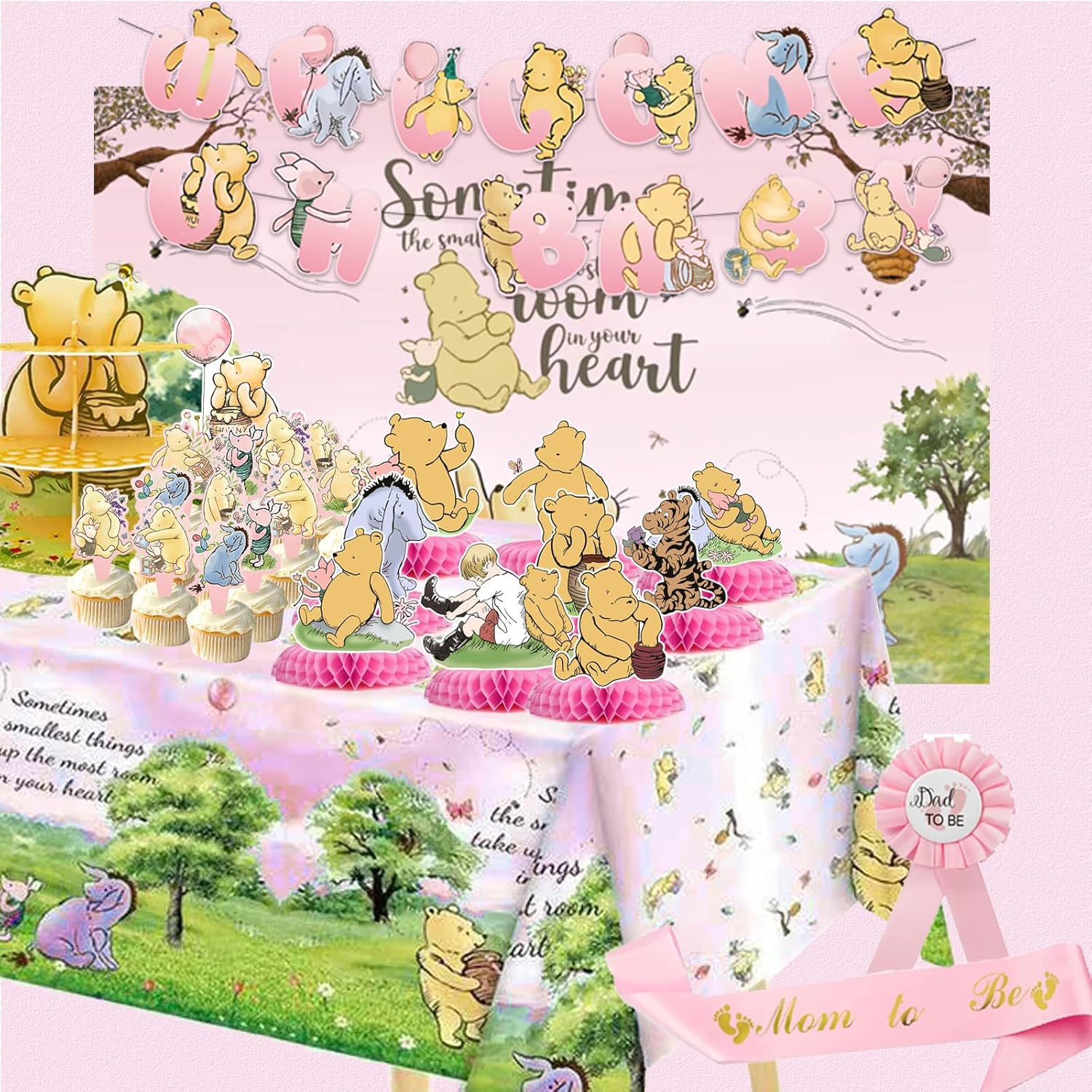 - All-in-1 Vintage Winnie Party Supplies Decorations Kit: 2 pcs OH baby welcome banner, 1pcs backdrop, 1pcs 3 Tier Winnie Dessert Holder,1pcs Winnie tablecloth, 1pcs"Mommy to Bee" Sash,1pcs"Daddy to Bee"Tinplate Badge,1pcs Winnie cake topper and 12 pcs Winnie cupcake toppers,9Pcs Winnie Honeycomb Centerpieces.Winnie baby shower decorations set can enrich the decoration of your baby shower party and add attractiveness to the party.
