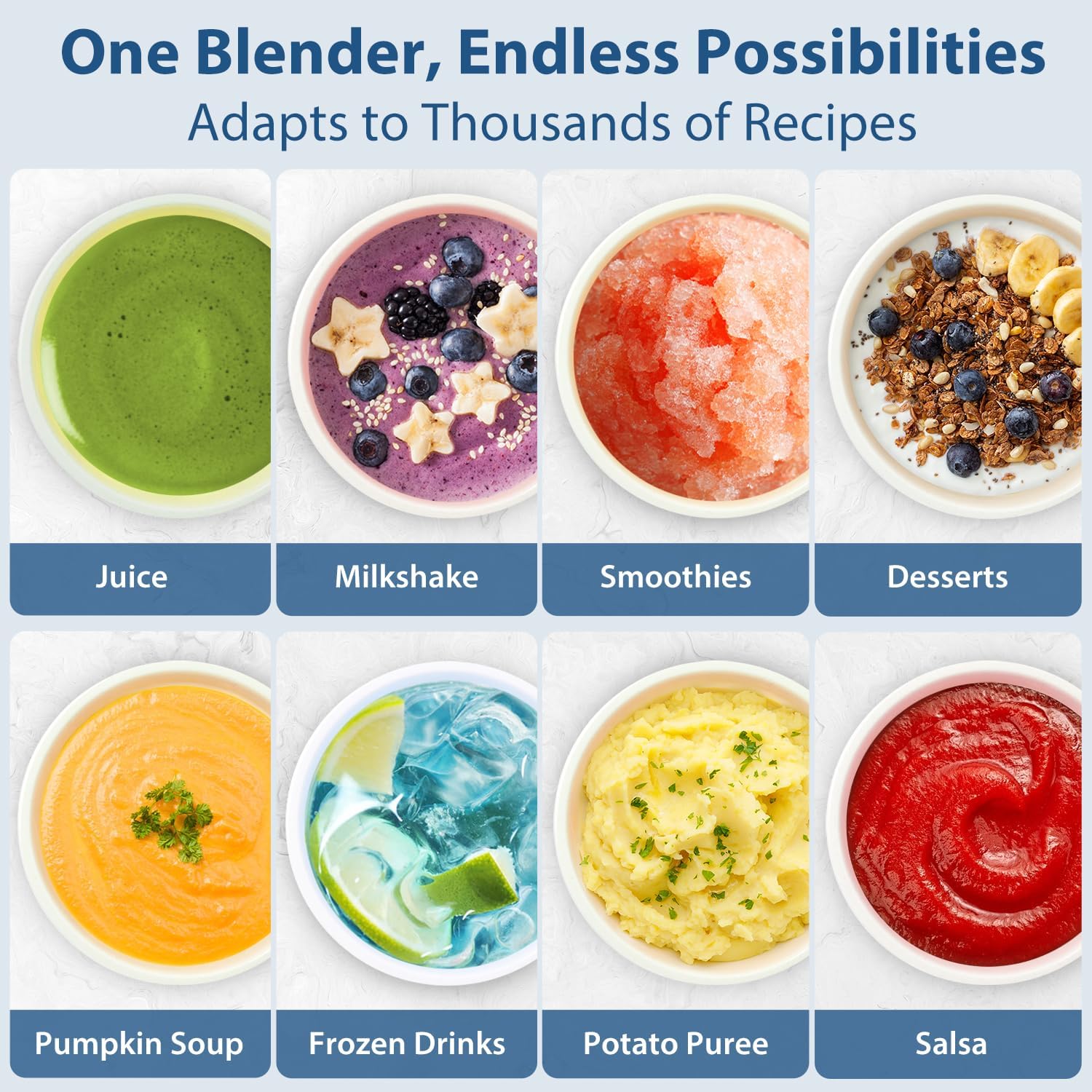- LED Display Panel: The countertop blender clear interface provides real-time monitoring of speed, time, and program status for intuitive operation. Its user-friendly design ensures precise control at every step, guaranteeing optimal blending results.