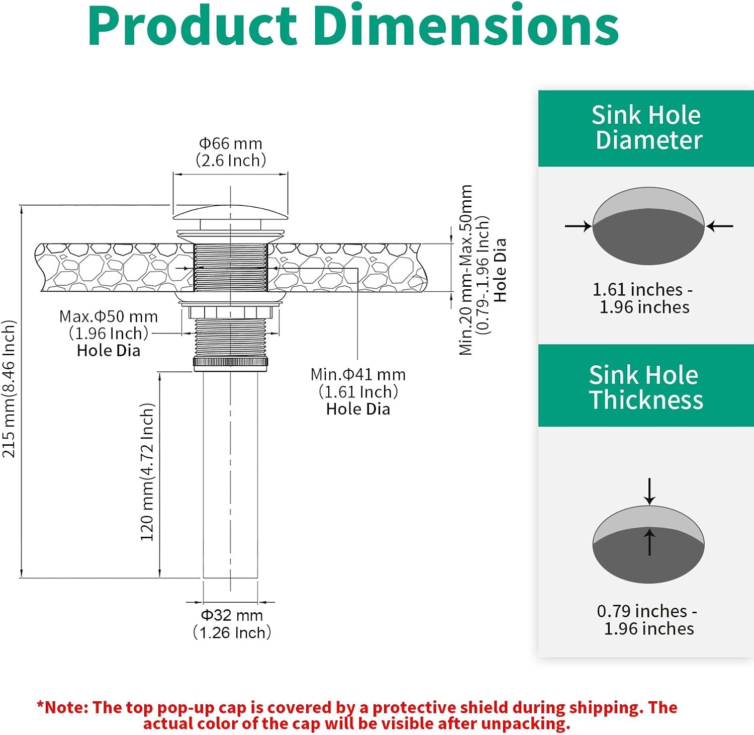 - 【Standard Size Drain】: This bathroom sink drain is suitable for the sink with overflow. Please confirm whether it matches the sink in your home before purchasing. Suitable for sink hole with diameter of 1.61 inches to 1.96 inches and fits drain pipe with a diameter of 1.25 inches or 1.5 inches. And the maximum thickness of basin is 1.96 inches. Most bathroom sinks and standard size water pipes can match our drain.