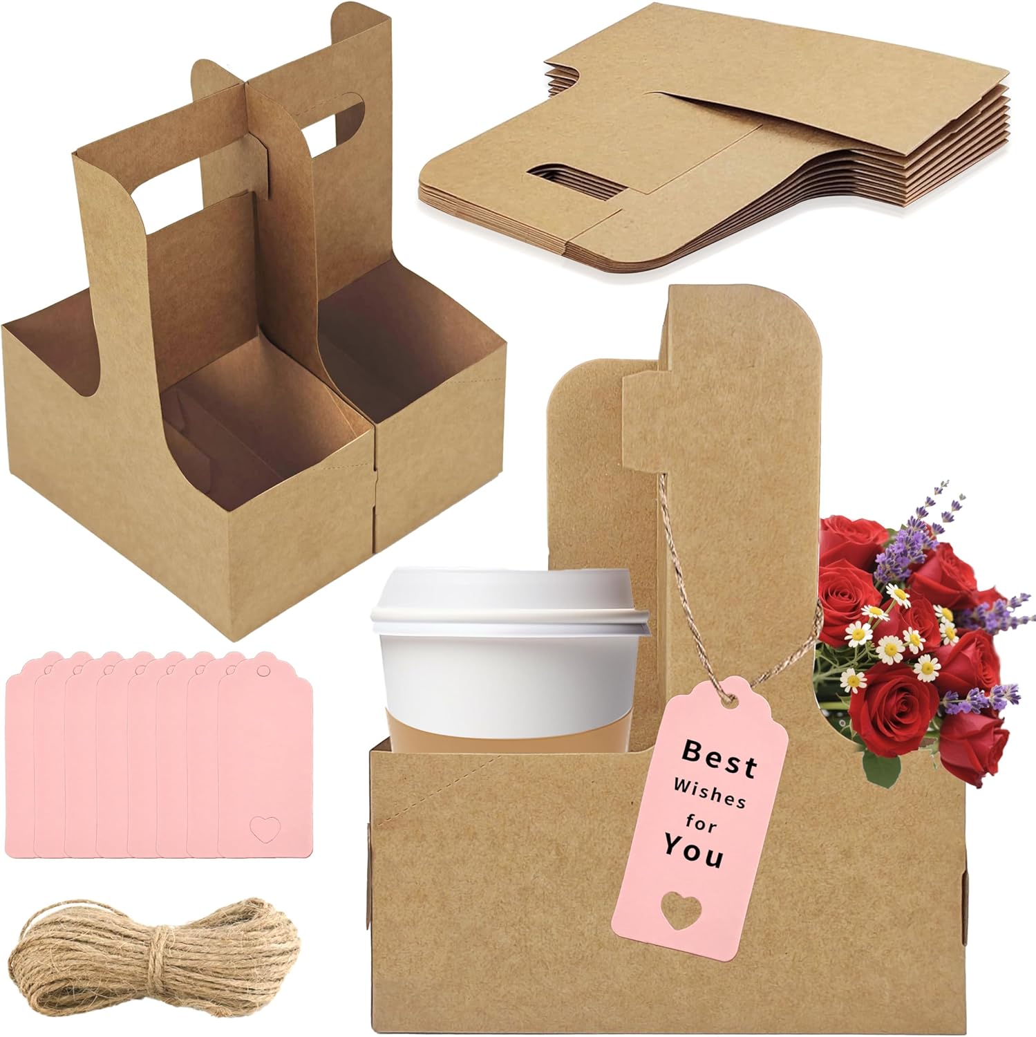 - Sturdy Coffee Cup Support: The coffee carrier is engineered to securely hold 2 coffee cups. The unfolded paper cup holder size is 17.5*9*22.5cm. Drink carrier reinforced structure and snug-fitting design prevent spills and ensure safe transport. The disposable cup holder's sturdy build provides a perfect space for arranging small floral bouquets.