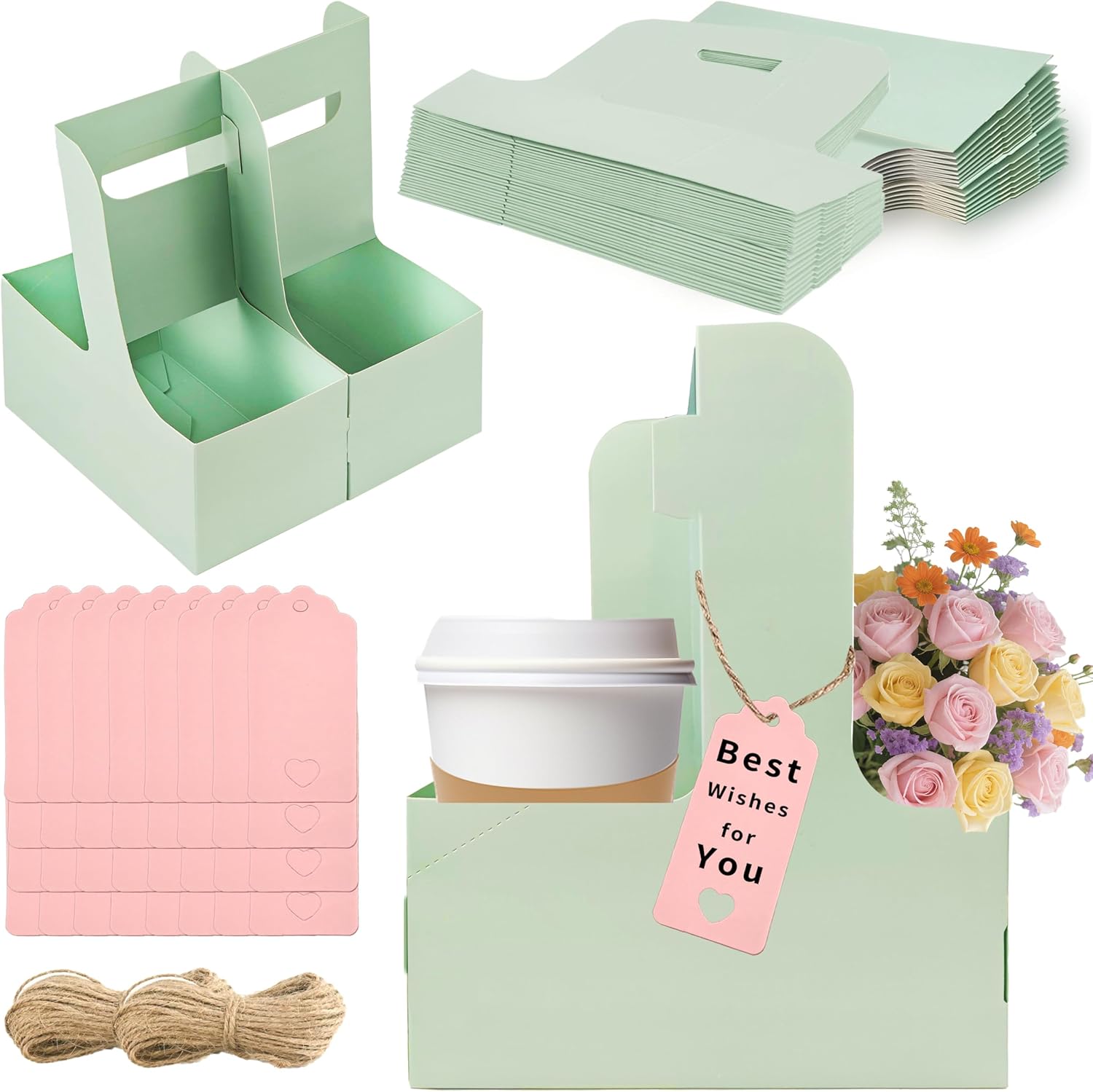 2 Cup Drink Carrier,32 Pack Coffee Cup Holders with Handle,Cardboard Cup Holders for Hot or Cold Drinks,Coffee Carrier with Ribbon and Card,Food Delivery Services and Bouquet(Green)