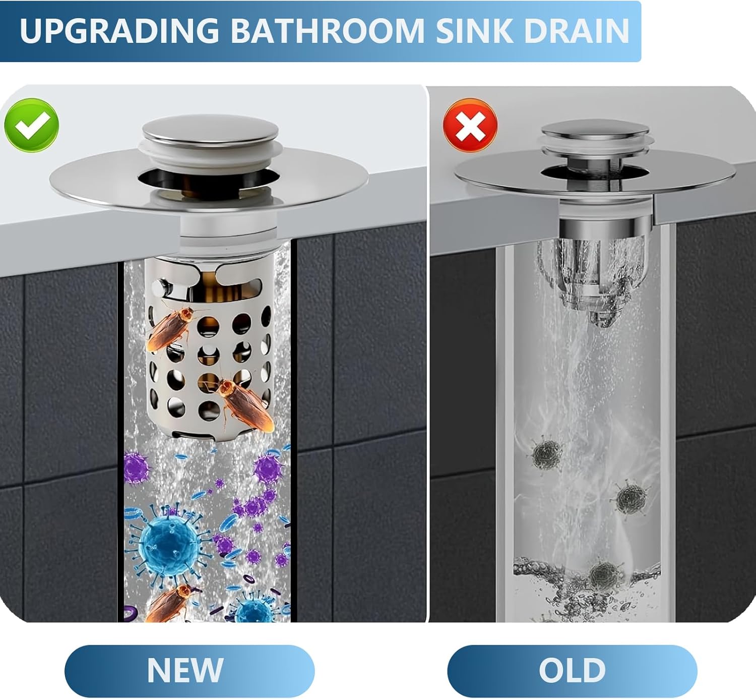 - Enhanced 3-in-1 Function: Our upgraded bathroom sink stopper features a unique design that combines water storage, fast drainage, and an efficient filtration system in one. The integrated filter captures tiny objects like hair, rings, and debris to ensure smooth drainage