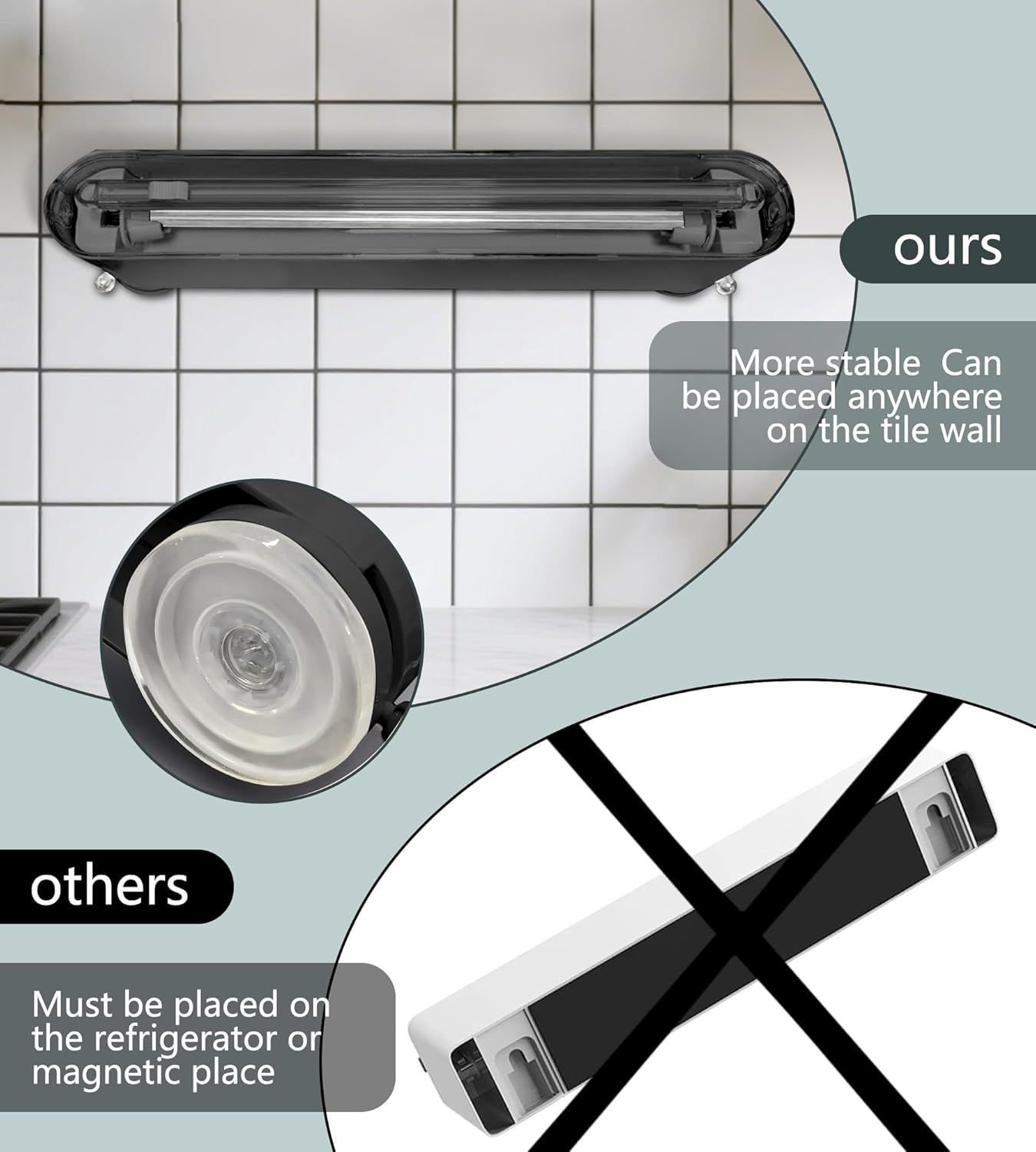- 【Wall-Mounted with Strong Tile Adhesion】Designed to stick firmly to tile walls, this wrap dispenser uses reusable adhesive pads (no drilling or magnets required) to stay securely in place — perfect for sleek kitchen setups without magnetic surfaces.