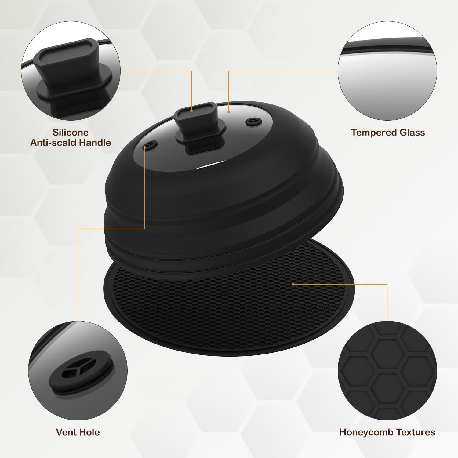 Lzerking Microwave Splatter Cover & Silicone Mat, 10.8 inch Glass Splatter Guard Lid with Collapsible Silicone for Food, Fits 6-10 inch Pot Plate Bowl, Heat Resistant, Dishwasher Safe, Kitchen, Black