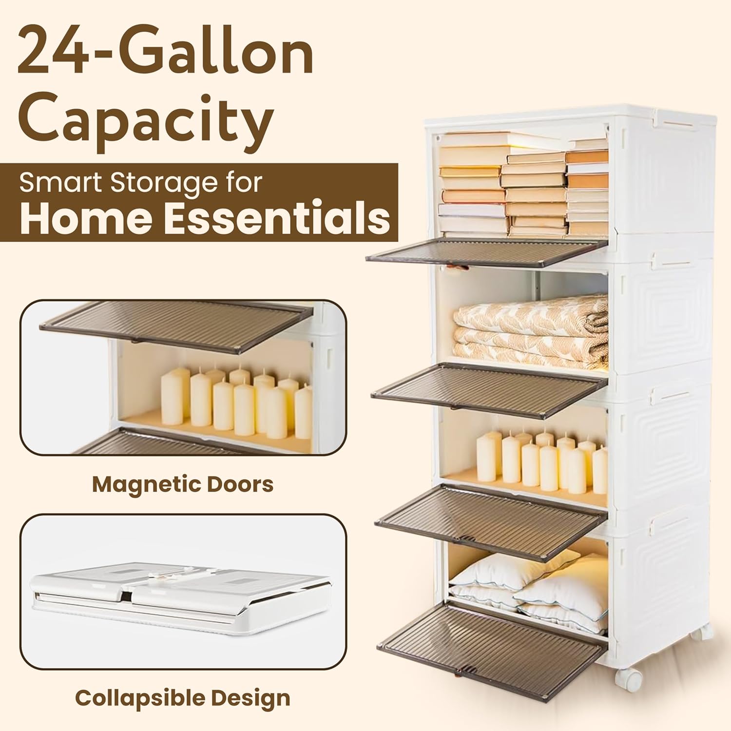 - SPACE-SAVING VERTICAL DESIGN: Stack up to 4 tiers to maximize storage in minimal floor space. Each 6-gallon bin (15"L x 10.5"W x 8.75"H) creates 24 gallons total capacity. Folds completely flat (1.75" height) when not in use, perfect for seasonal storage and small spaces.