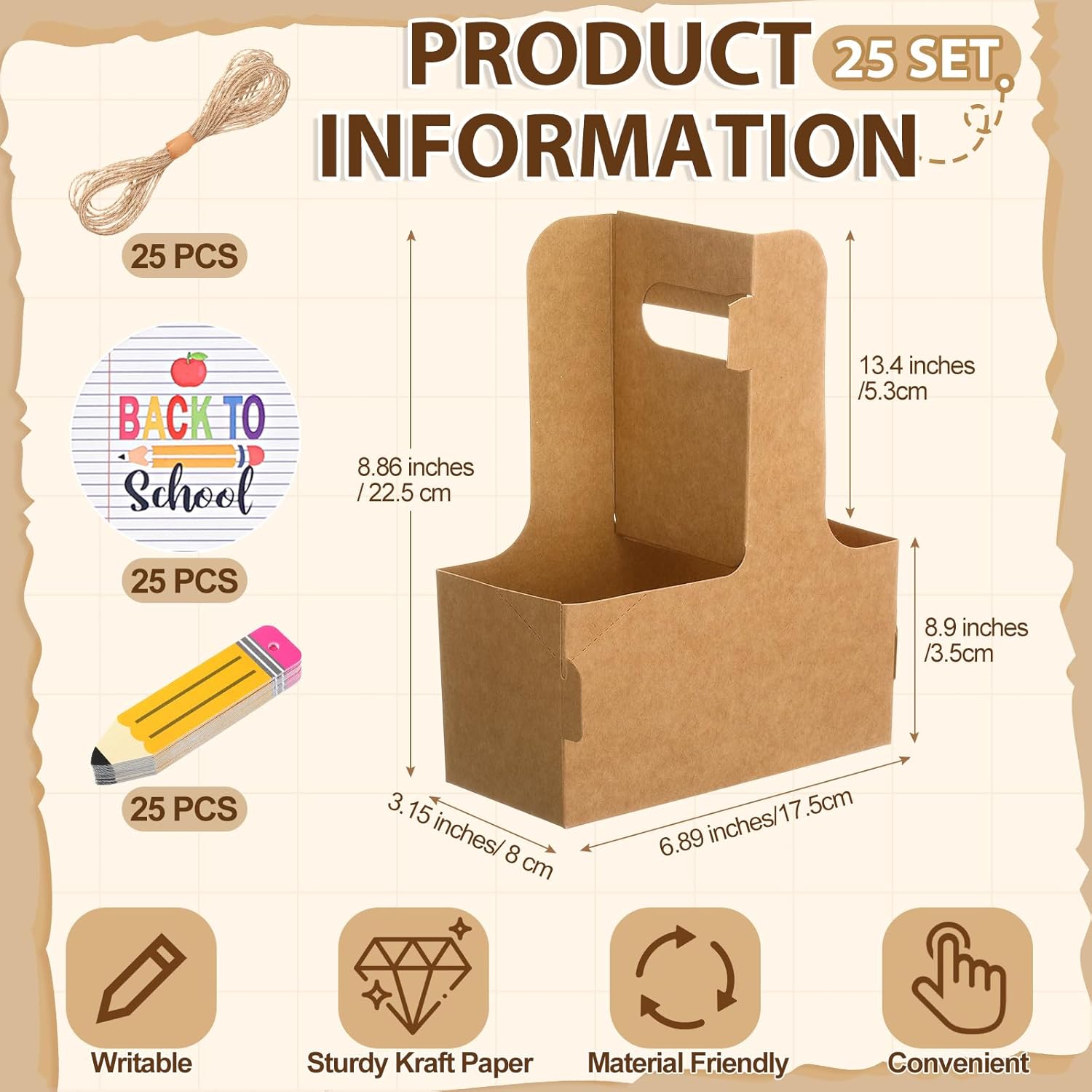 - Sufficient Quantity: this 2 cup carriers for drinks set package contains a total of 25 brown cardboard two cup drink holders, and also comes with 25 pencil gift tags and one roll of hemp rope, 25 pcs Back to school Stickers; Our Back to School Drink Carrier with Handle set are suitable for back to school parties, first day of school party, teacher's day, other festivals or use daily