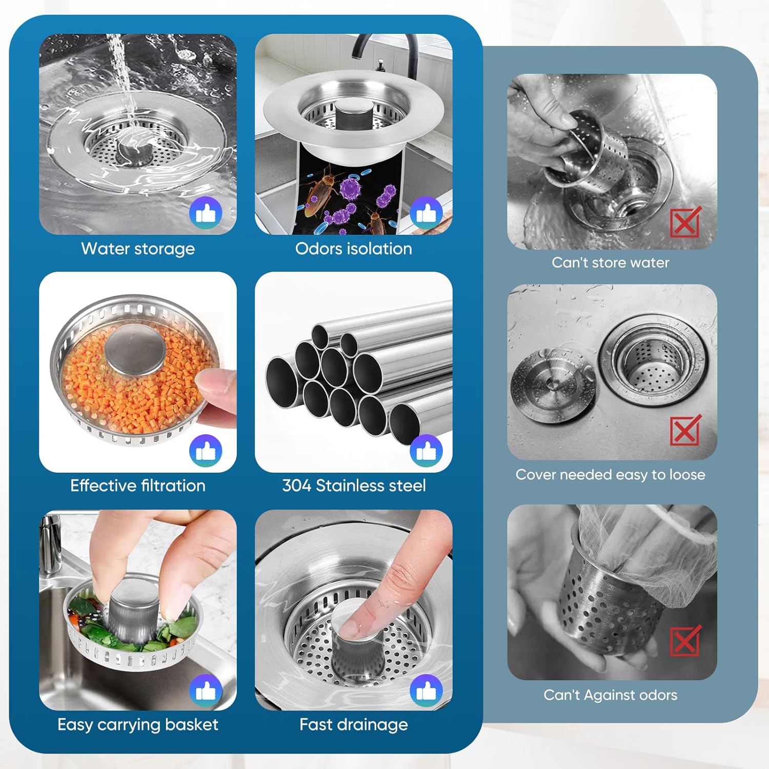 - 【Upgraded 3-in-1 Kitchen Sink Drain Strainer】This kitchen sink drain strainer combines a sink stopper, food scrap filter, and odor blocker in one. Simply press to switch between water storage and fast drainage modes while trapping debris.The removable basket makes cleaning the residue a breeze.Time-saving and money-saving.NOTE:In case of any quality issues with the product, feel free to contact us at any time,Product replacement is available.We are always committed to closely following customer responses and ensuring a satisfying customer experience.