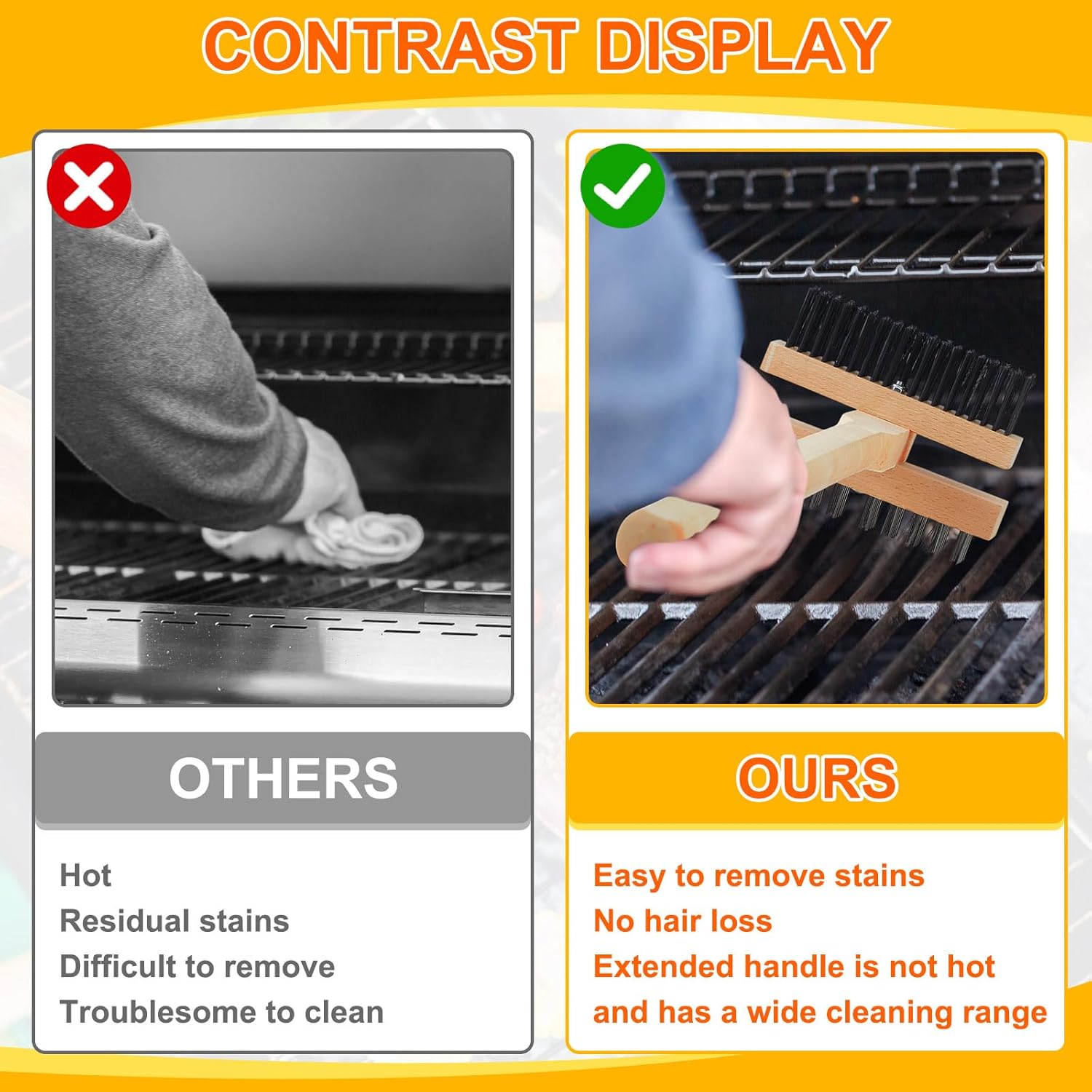 - High Materials: our Commercial grill brush heads are made of quality stainless steel bristles to prevent dropping while quickly removing all types of sediment, handles are made of quality wood, and long, strong wooden handles increase stretch and control for a comfortable and efficient cleaning