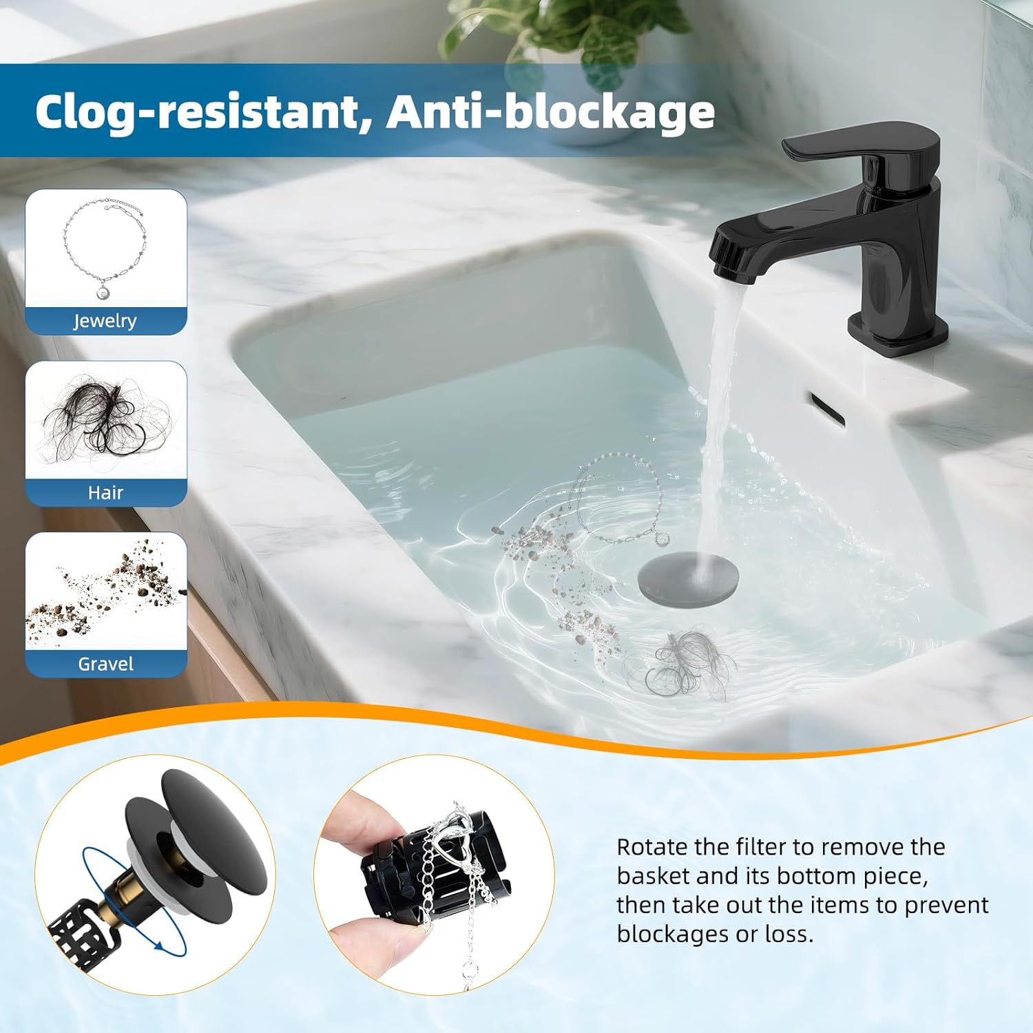 - [3-in-1 Multifunctional Drain Stopper] This bathroom sink drain plug boasts an innovative 3-in-1 design that seamlessly integrates water storage, fast drainage, and effective filtering functions. The storage mode, it caters to your soaking or washing needs, while the drainage mode efficiently empties the sink. The built-in basket captures small items like hair, jewelry, and debris, preventing them from clogging the drain and allowing you to recover valuable items like earrings and necklaces