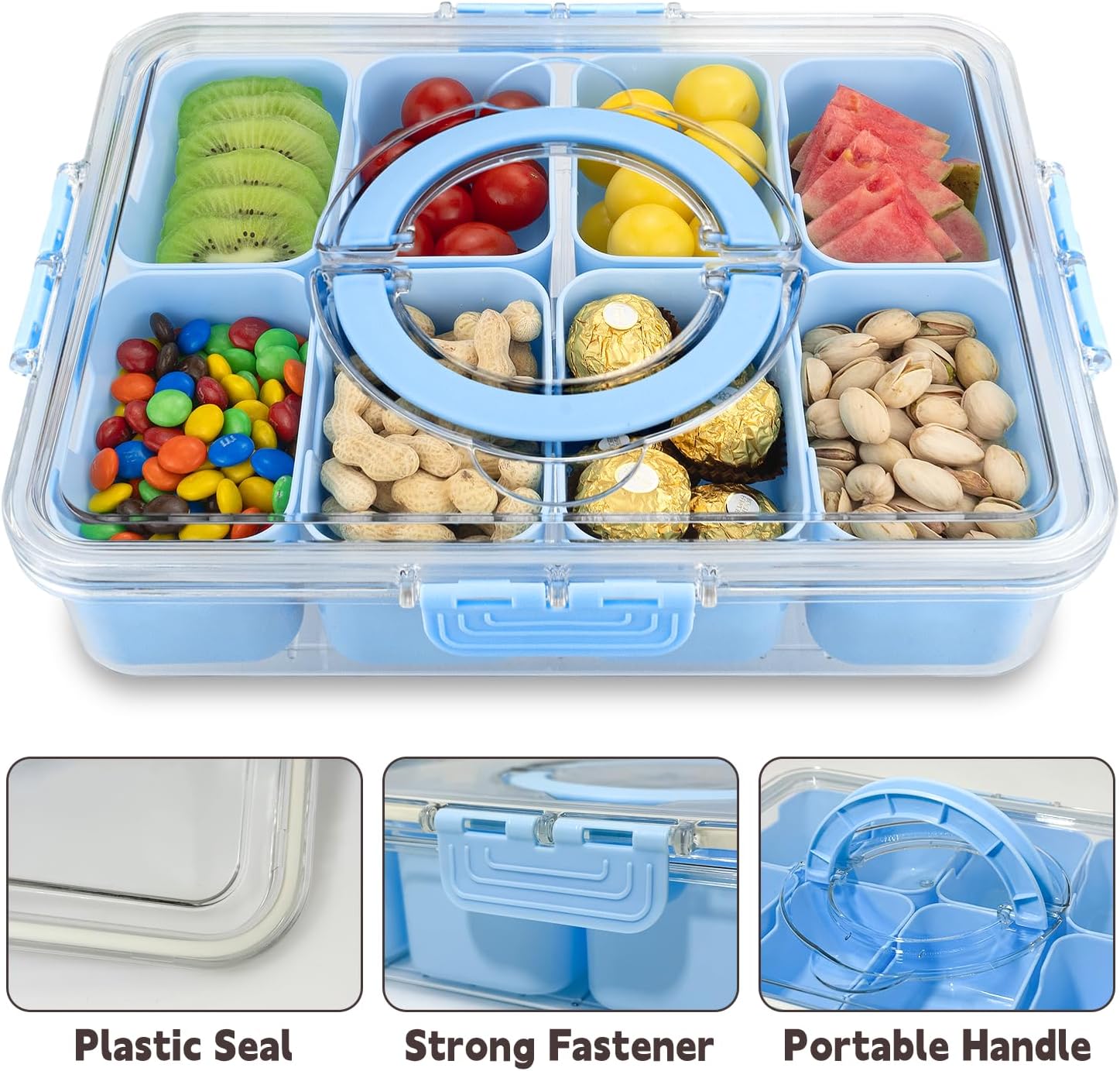 Divided Serving Tray with Lid and Handle,8 Compartments Snacks Box,Snack Fruit Veggie Tray,Portable Platter for Candy Fruits Nuts Snack Party Entertaining Picnic (Blue)