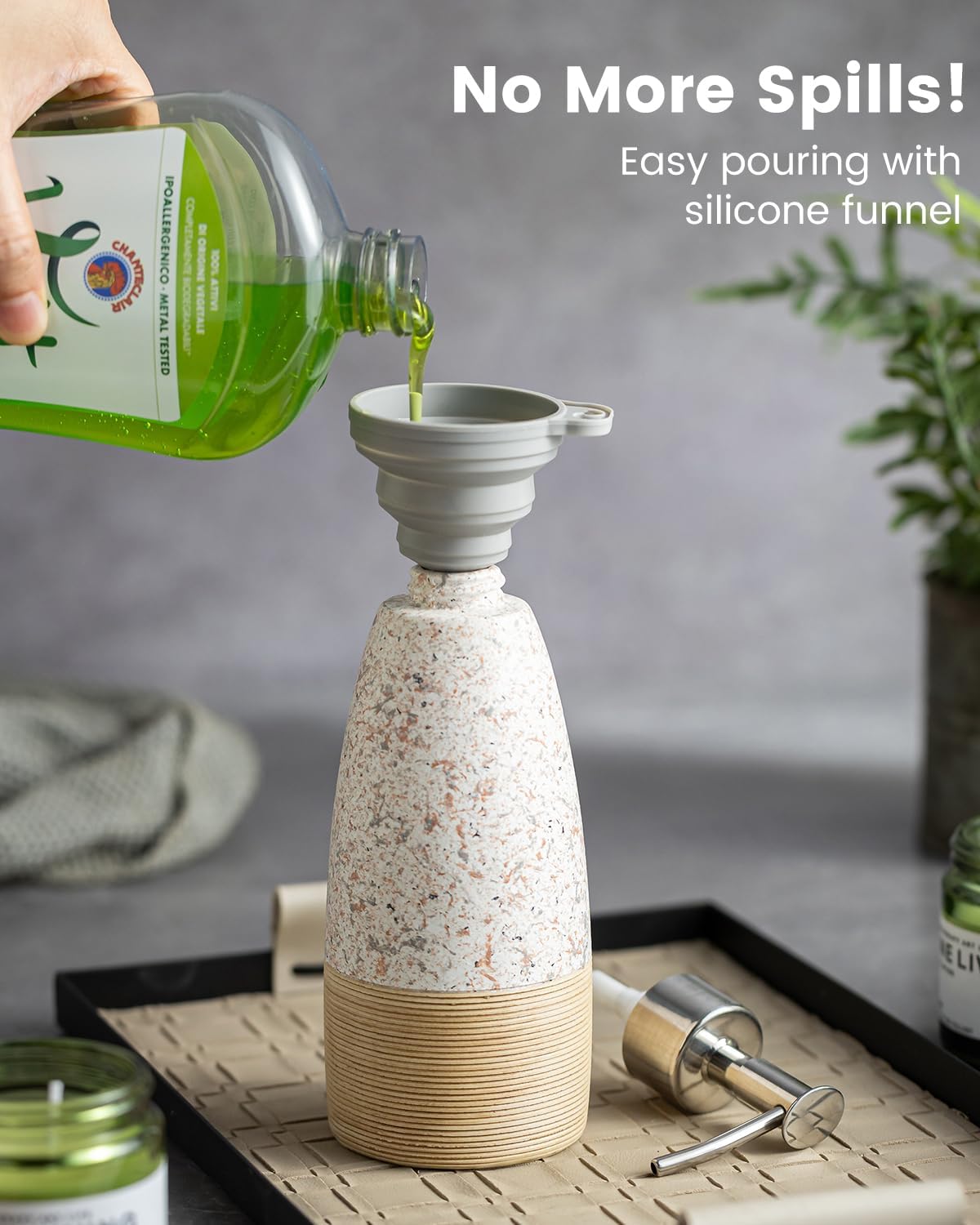 - Silicone Funnel: The dish soap dispenser for kitchen is equipped with a flexible silicone funnel, making refills easy and spill-free. This ensures that no liquid overflows, keeping your countertop neat and dry at all times