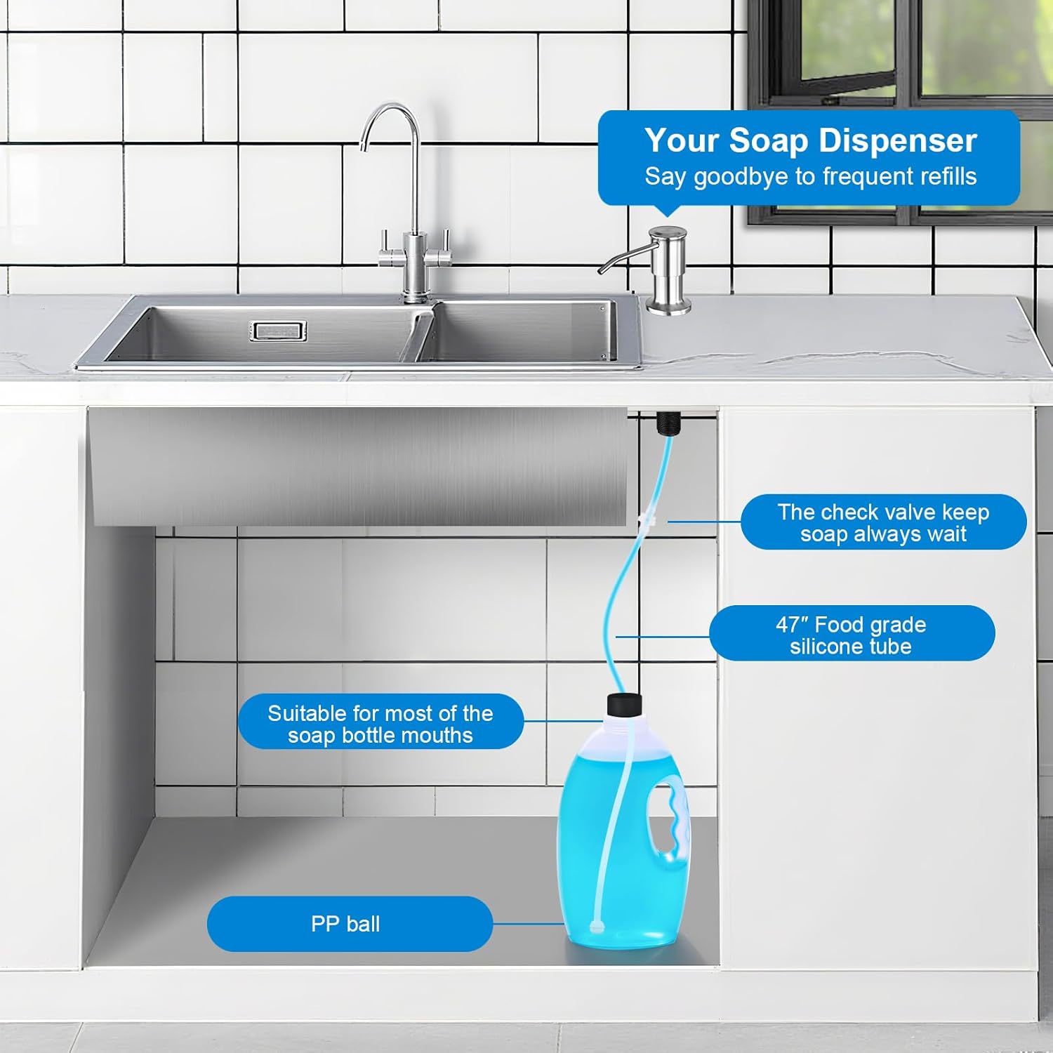- No Filling Frequently: No more crawling under the sink. Our Soap Dispenser for Kitchen Sink comes with a 47” tube that plugs directly into a large dish soap bottle, saying goodbye to frequent refills.
