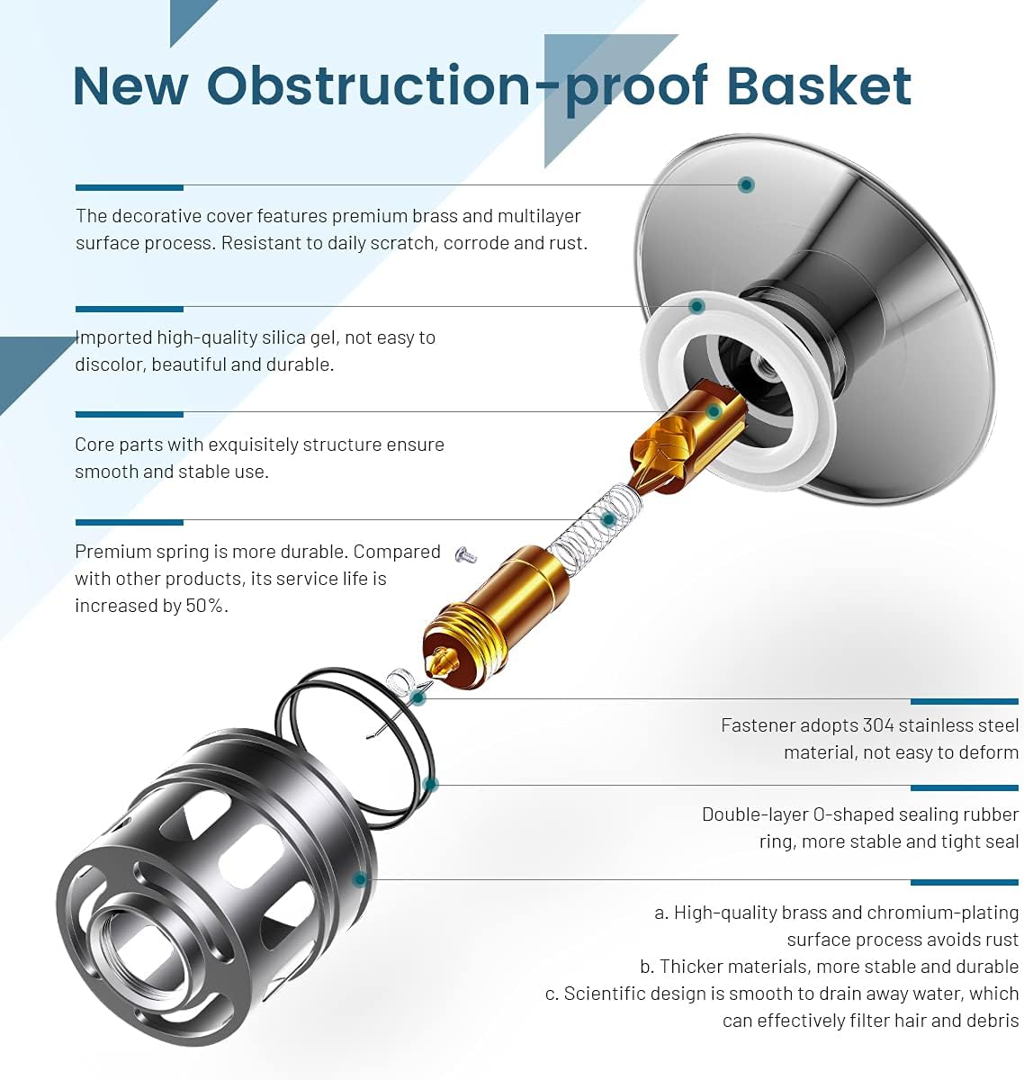 - 【BUILD-IN STRAINER】Unlike regular puch button drain,this drain stopper has a anti-clogging basket strainer inside that neatly collecting hairs and prevents the drain from clogging up,stuff will not get into the drain, such as jewelry, ring, dirt and so on.
