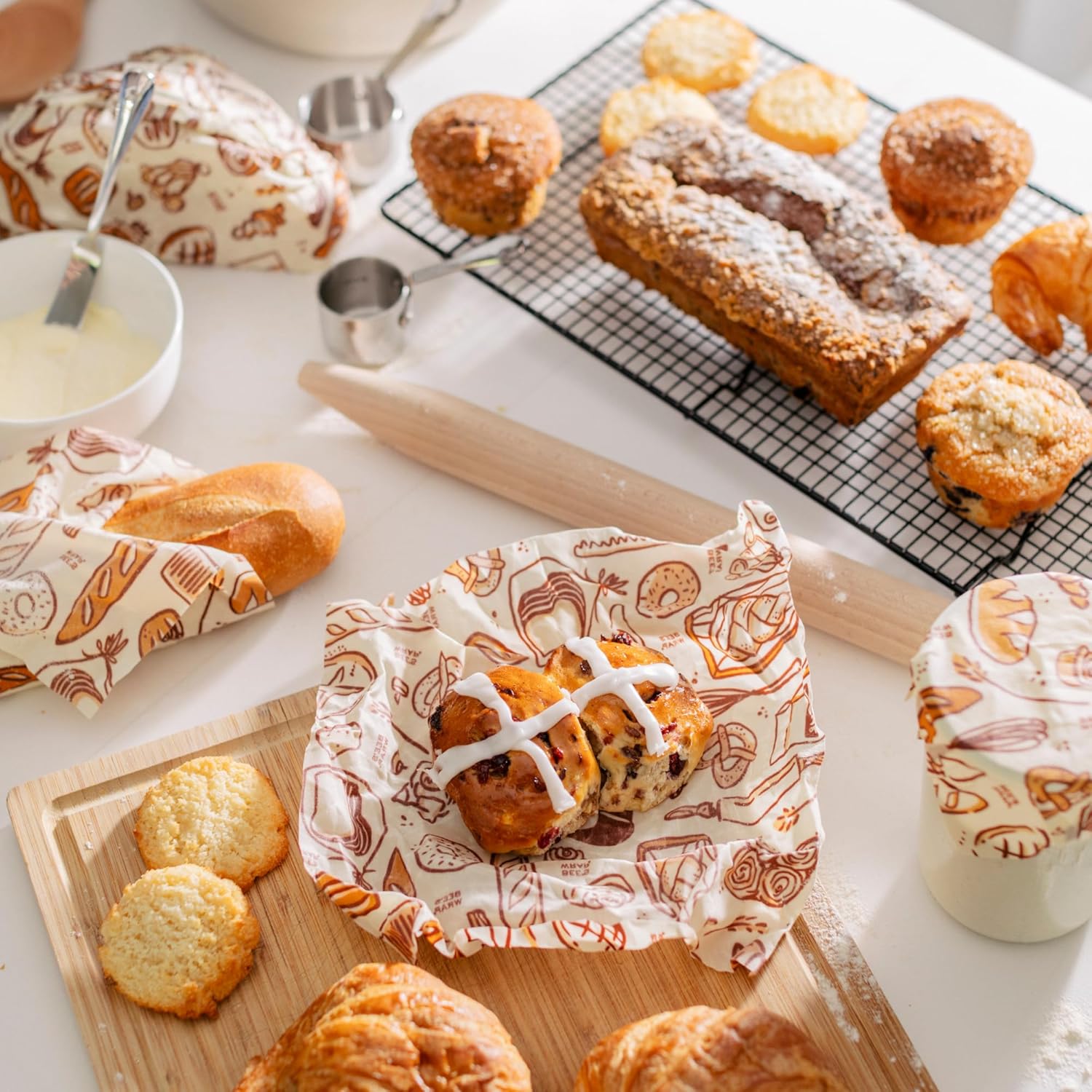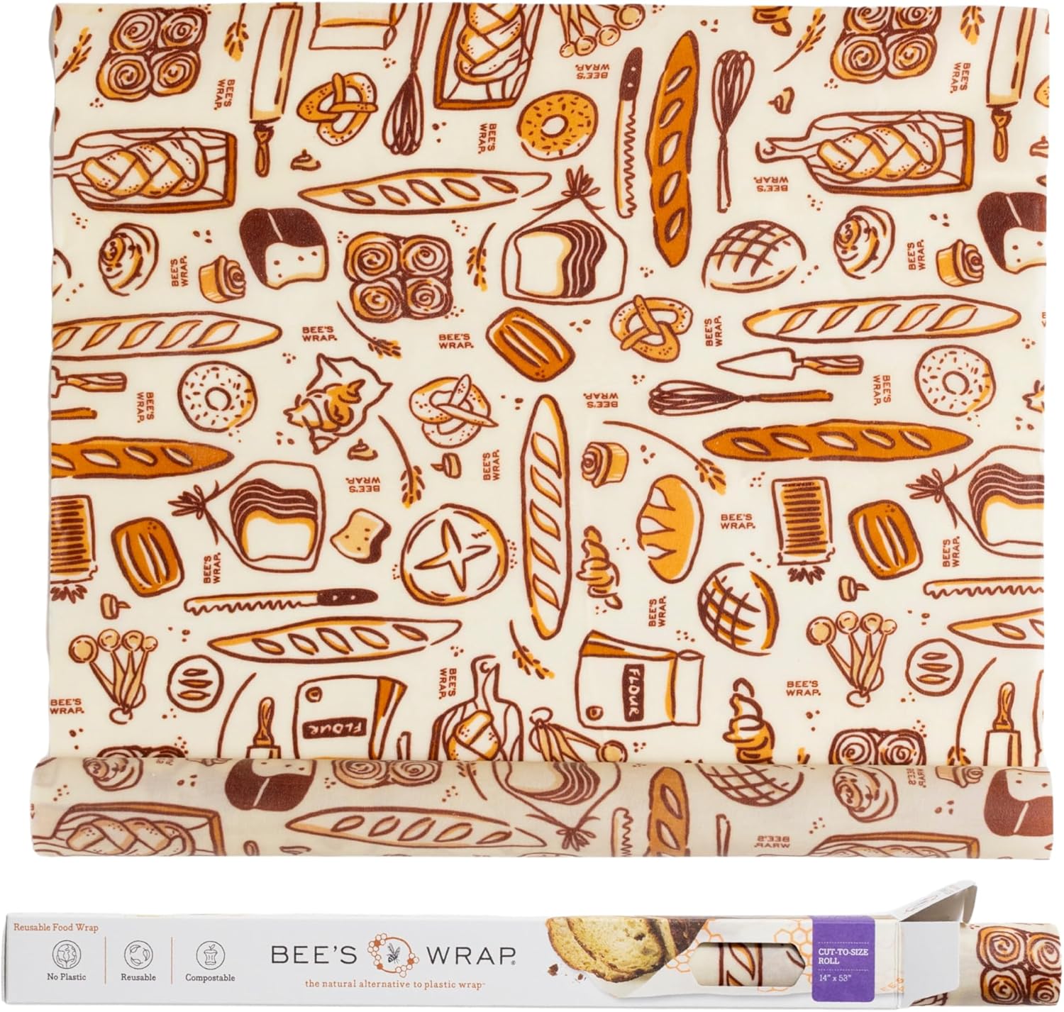 - BEESWAX WRAPS FOR FOOD in a large 14" x 52" wax paper roll featuring a fun bakery pattern with bread, rolls, bagels, flour and more. Made in USA reusable beeswax food wraps are a great alternative to single use plastic wrap, sandwich wraps, and aluminum foil.