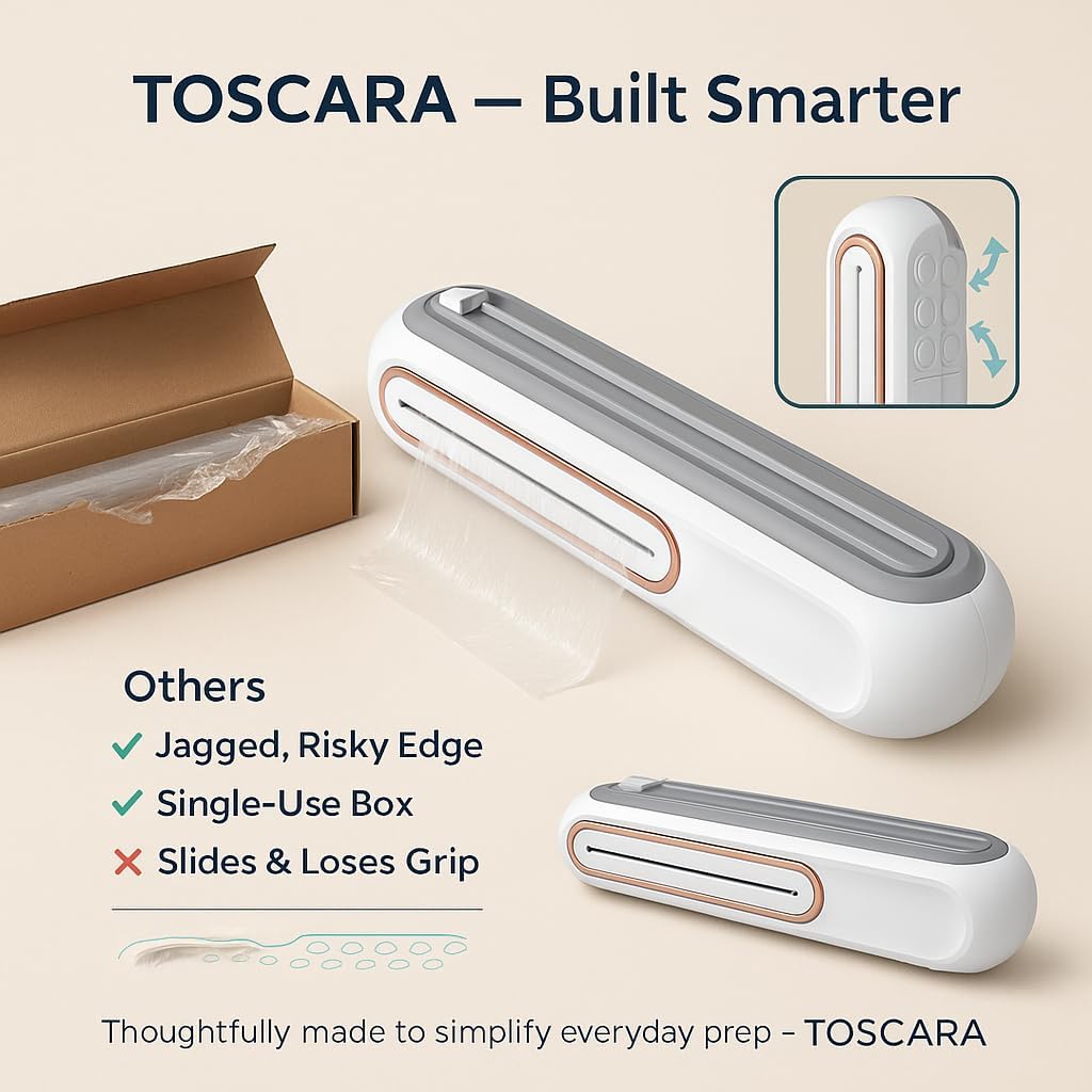 - ✨ 𝐒𝐀𝐅𝐄 𝐒𝐋𝐈𝐃𝐄 𝐂𝐔𝐓𝐓𝐄𝐑 𝐃𝐄𝐒𝐈𝐆𝐍 – Hidden two-way sliding blade cuts cling wrap, foil, or baking paper smoothly without jagged edges or finger risk.